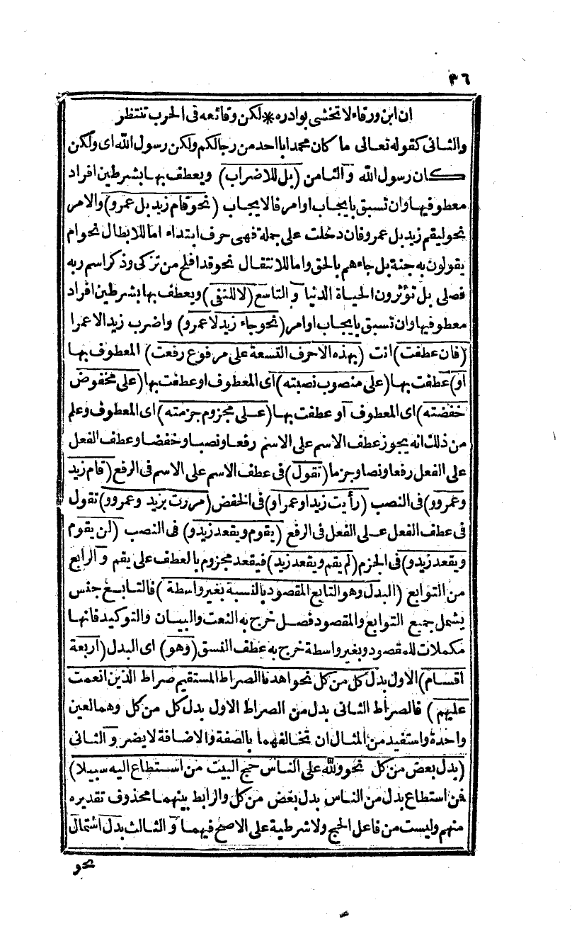 والثاني كقوله تعالى: {ما كان محمد أبا أحد من رجالكم ولكن رسول الله} أي ولكن كان رسول الله والثامن (بل للإضراب) ويعطف بها بشرطين افراد معطوفيها وأن تسبق بإيجاب أوامر فالإيجاب (نحو قام زيد بل عمرو) والأمر نحو ليقم زيد بل عمرو فإن دخلت على جملة فهي حرف ابتداء أما للإبطال نحو أم يقولون به جنة بل جاءهم بالحق وأما للانتقال نحو قد أفلح من تزكى وذكر اسم ربه فصلى بل تؤثرون الحياة الدنيا والتاسع (لا للنفي) ويعطف بها بشرطين إفراد معطوفيها وأن تسبق بإيجاب أوامر (نحو جاء زيد لا عمرو) واضرب زيدا لا عمرا (فإن عطفت) أنت (بهذه الأحرف) التسعة (على مرفوع رفعت) المعطوف بها (أو عطفت بها على منصوب نصبته) أي المعطوف (أو) عطفت بها (على مخفوض خفضته) أي المعطوف (أو) عطفت بها (على مجزوم جزمته) أي المعطوف وعلم من ذلك أنه يجوز عطف الاسم على الاسم رفعا ونصبا وخفضا وعطف الفعل على الفعل رفعا ونصا وجزما (تقول) في عطف الاسم على الاسم في الرفع (قام زيد وعمرو و) في النصب (رأيت زيد وعمرًا و) في الخفض (مررت بزيد وعمرو و) تقول في عطف الفعل على الفعل في الرفع (يقوم زيد ويقعد) في النصب (ولن يقوم ويقعد زيد و) في الجزم (لم يقم ويقعد زيد) فيقعد مجزوم بالعطف على يقم والرابع من التوابع (البدل وهو التابع المقصود بالنسبة بغير واسطة) فالتابع جنس يشمل جميع التوابع والمقصود فصل خرج به النعت والبيان والتوكيد فإنها مكملات للمقصود بغير واسطة خرج به عطف النسق (وهو) أي البدل (أربعة أقسام) الأول بدل كل من كل، نحو: {أهدنا الصراط المستقيم * صراط الذين أنعمت عليهم} فالصراط الثاني بدل من الصراط الأول بدل كل من كل وهما لعين واحدة واستفيد من المثال أن تخالفهما بالصفة والأضافة لا يضر والثاني (وبدل بعض من كل نحو {ولله على الناس حج البيت من استطاع إليه سبيلا}) فمن استطاع بدل من الناس بدل بعض من كل والرابط بينهما محذوف تقديره منهم وليست من فاعل الحج ولا شرطية على الأصح فيهما والثالث (بدل اشتمال
