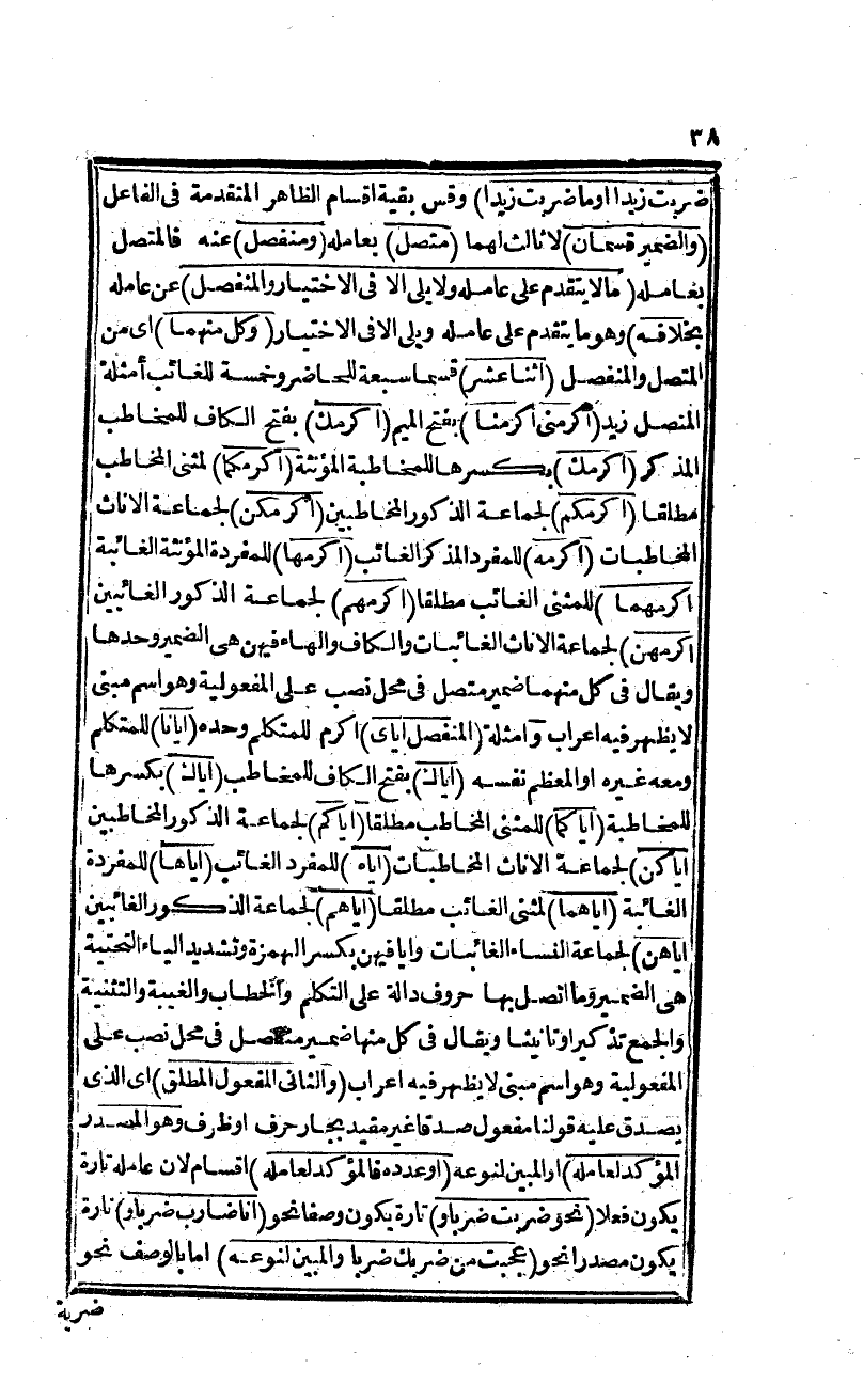 ضربت زيدًا وما ضربت زيدًا) وقس بقية أقسام الظاهر المتقدمة في الفاعل (والمضمر قسمان) لا ثالث لهما (متصل) بعامله (ومنفصل) عنه (فالمتصل) بعامله (ما لا يتقدم على عامله ولا يلي إلا في الاختيار والمنفصل) عن عامله (بخلافه) وهو ما يتقدم على عامله ويلي إلا في الاختيار (وكل منهما) أي من المتصل والمفصل (اثنا عشر) قسما سبعة للحاضر وخمسة للغائب أمثلة (المتصل) زيد (أكرمني، أكرمنا) بفتح الميم (أكرمكما) لمثنى المخاطب مطلقا (أكرمكم) لجماعة الذكور المخاطبين (أكرمكن) لجماعة الإناث المخاطبات (أكرمه) للمفرد المذكر الغائب (أكرمها) للمفردة المؤنثة الغائبة (أكرمهما) للمثنى الغائب مطلقا (أكرمهم) لجماعة الذكور الغائبين (أكرمهن) لجماعة الآناث الغائبات والكاف والهاء فيهن هي الضمير وحدها ويقال في كل منهما ضمير متصل في محل نصب على المفعولية وهو اسم مبني لا يظهر فيه إعراب وأمثلة (المنفصل أياي) أكرم للمتكلم وحده (إيانا) للمتكلم ومعه غيره أو المعظم نفسه (إياك) بفتح الكاف للمخاطب (إياك) بكسرها للمخاطبة (إياكما) للمثنى المخاطب مطلقا (إياكم) لجماعة الذكور المخاطبين (إياكن، إباه، إباها، إياهما، إياهم، إياهن) لجماعة النساء الغائبات وأيا فيهن بكسر الهمزة وتشديد الياء التحتية والجمع النساء الغائبات وايا فيهن بكسر الهمزة وتشديد الياء التحتية هي الضمير وما اتصل بها حروف دالة على التكلم والخطاب والغيبة والتثنية والجمع تذكيرا أو تانيثا ويقال في كل منها ضمير منفصل في محل نصب على المفعولية وهو اسم مبني لا يظهر فيه إعراب والثاني (المفعول المطلق) أي الذي يصدق عليه قولنا مفعول صدقا غير مقيد بجار حرف أو ظرف و (هو المصدر المؤكد لعامله أو المبين لنوعه أو لعدده فالمؤكد لعامله) أقسام لأن عامله تارة يكون فعلا (نحو ضربت ضربًا و) تارة يكون وصفا نحو (أنا ضارب ضربا و) تارة يكون مصدرا نحو (عجبت من ضربك ضربًا والمبين لنوعه) أما بالوصف (نحو