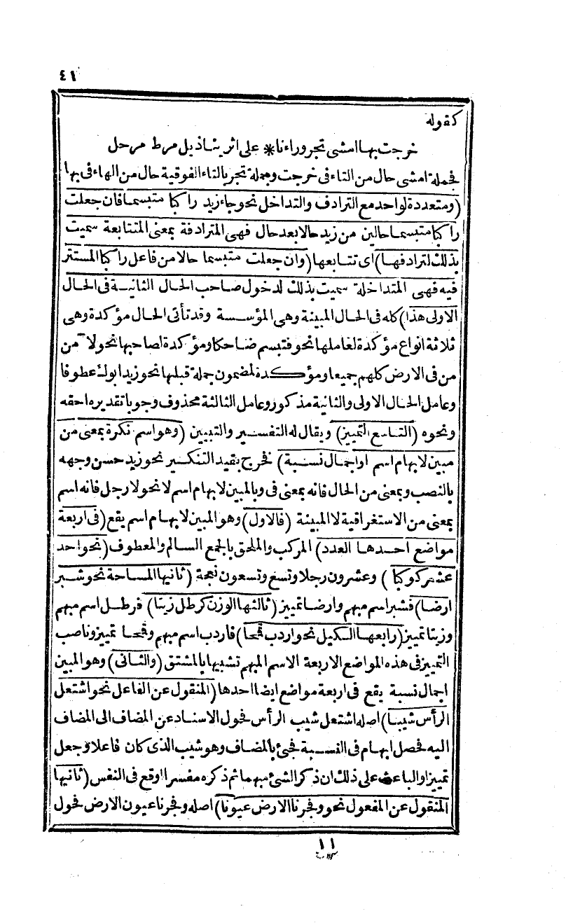 فجملة امشي حال من التاء في خرجت وجملة تجر بالتاء الفوقية حال من الهاء في بها (ومتعددة لواحد مع الترادف أو التداخل نحو: جاء زيد راكبًا مبتسمًا) فإن جعلت راكبا متبسما حالين من زيد حالا بعد حال فهي المترادفة بمعنى المتتابعة سميت بذلك لترادفها أي تتابعها وإن جعلت متبسما حالا من فاعل راكبا المستتر فيه فهي المتداخلة سميت بذلك لدخول صاحب الحال الثانية في الحال الأولى هذا كله في الحال المبينة وهي المؤسسة ( ... وقد تأتي الحال مؤكدة) وهي ثلاثة أنواع (مؤكدة لعاملها نحو فتبسم ضاحكًا ومؤكدة لصاحبها نحو لآمن من في الأرض كلهم جميعًا. ومؤكدة لمضمون جملة قبلها نحو زيدا بوك عطوفا) وعامل الحال الأولى والثانية مذكور وعامل الثالثة محذوف وجوبا تقديره احقه ونحو التاسع (التمييز) ويقال له التفسير والتبيين (وهو اسم نكرة بمعنى من مبين لإيهام اسم أو إجمال نسبة) فخرج بقيد التنكير نحو زيد حسن وجهه بالنصب وبمعنى من الحال فإنه بمعنى في وبالمبين لإبهام اسم يقع ( ... فالأول في أربعة مواضع أحدها العدد المركب) والملحق بالجمع السالم والمعطوف (نحو أحد عشر كوكبا) وعشرون رجلا وتسع نعجة (ثانيها المساحة نحو شبر أرضًا) فشبر اسم مبهم وأرضًا تمييز (ثالثها الوزن نحو: رطل زيتًا) فرطل اسم مبهم وزيتا تمييز (رابعها الكيل نحو إردب قمحًا) فاردب اسم مبهم وقمحا تمييز وناصب التمييز في هذه المواضع الأربعة الاسم المبهم تشبيها بالمشتق (والثاني) وهو المبين إجمال نسبة يقع (في أربعة مواضع أيضًا أحدها المنقول عن الفاعل نحو اشتعل الرأس شيبًا) أصله اشتعل شيب الرأس فحول الإسناد عن المضاف إلى المضاف إليه فحصل إبهام في النسبة فجيء بالمضاف وهو شيب الذي كان فاعلا وجعل تمييزا والباعث على ذلك أن ذكر الشيء مبهما ثم ذكره مفسرا الوقع في النفس (ثانيها المنقول عن المفعول نحو وفجرنا الأرض عيونًا) أصله وفجرنا عيون الأرض فحول