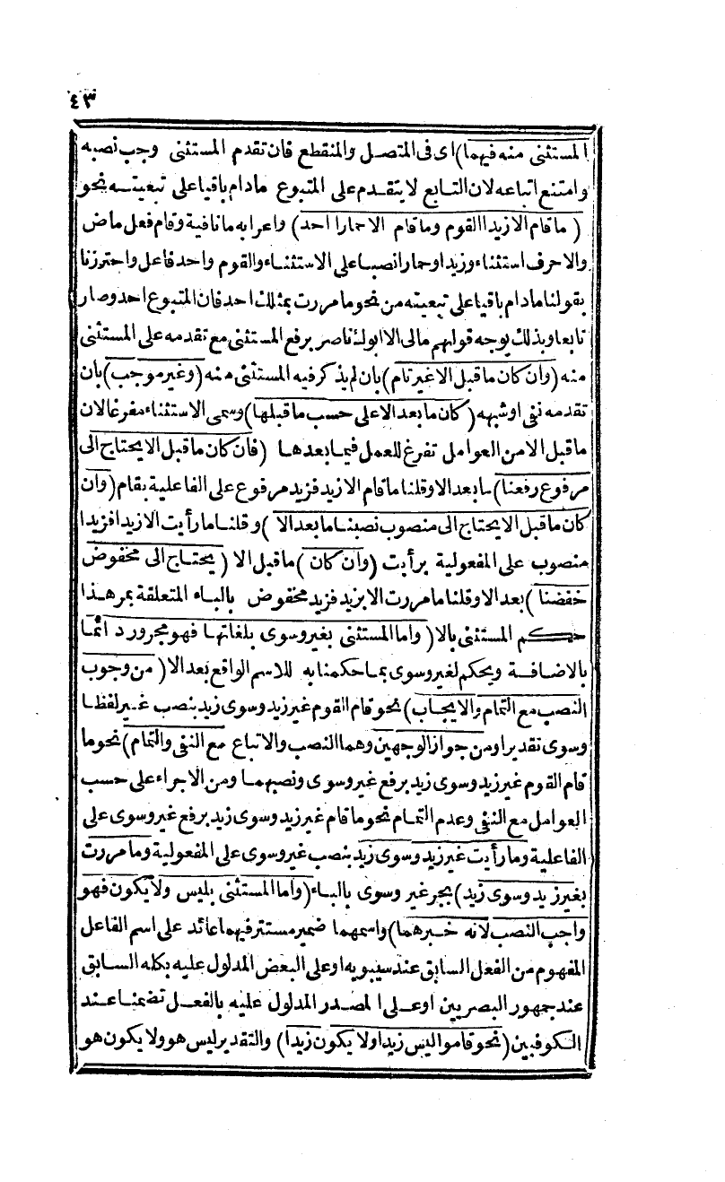 المستثنى منه فيهما) أي في المتصل والمنقطع (فإن تقدم) المستثنى (وجب نصبه) وامتنع إتباعه لأن التابع لا يتقدم على المتبوع ما دام باقيا على تبعيته (نحو ما قام إلا زيد القوم وما قام إلا حمارا أحد) وإعرابه ما نافيه وقام فعل ماض والأحرف استثناء وزيد أو حمارا نصبا على الاستثناء والقوم واحد فاعل واحترزنا بقولنا ما دام باقيا على تبعيته من نحو ما مررت بمثلك حد فإن المتبوع أحد وصار تابعا وبذلك يوجه قولهم مالي إلا أبوك ناصر برفع المستثنى مع تقدمه على المستثنى منه (وإن كان ما قبل إلا غير تام) بأن لم يذكر فيه المستثنى منه (وغير موجب) بأن تقدمه نفي أو شبهه (كان ما بعد إلا على حسب ما قبلها) وسمى الاستثناء مفرغا لأن ما قبل الأمن العوامل تفرغ للعمل فيما بعدها (فإن كان ما قبل ألا يحتاج إلى مرفوع رفعنا ما بعد إلا) وقلنا ما قام إلا زيد فزيد مرفوع على الفاعلية يقام (وإن كان ما قبل إلا يحتاج إلى منصوب نصبنا ما بعد ألا) وقلنا ما رأيت إلا زيدا فزيدا منصوب على المفعولية برأيت (وأن كان) ما قبل إلا (يحتاج إلى مخفوض خفضنا ما بعد ألا) وقلنا ما مررت إلا بزيد فزيد مخفوض بالباء المتعلقة بمر هذا حكم المستثنى بالا (وأما المستثنى بغير، وسوى) بلغاتها (فهو مجرور دائما) بالإضافة (ويحكم لغير وسوى بما حكم به للاسم الواقع بعد إلا من وجوب النصب مع التمام والإيجاب) نحو قام القوم غير زيد وسوى زيد بنصب غير لفظا وسوى تقديرا (ومن جواز الوجهين) وهما النصب والإتباع (مع النقص والتمام) نحو ما قام القوم غير زيد وسوى زيد برفع غير وسوى ونصبهما (ومن الأجراء على حسب العوامل مع النقص وعدم التمام) نحو ما قام غير زيد وسوى زيد برفع غير وسوىعلى الفاعلية وما رأيت غير زيد وسوى زيد بنصب غير وسوى على المفعولية وما مررت بغير زيد وسوى زيد بجر غير وسوى بالباء (وأما المستثنى بليس ولا يكون فهو واجب النصب) لأنه خبرهما واسمهما ضمير مستتر فيهما عائد على اسم الفاعل المفهوم من الفعل السابق عند سيبويه أو على البعض المدلول عليه بكله السابق عند جمهور البصريين أو على المصدر المدلول عليه بالفعل تضمنا عند الكوفيين (نحو ليس زيدا ولا يكون زيدا) والتقدير ليس هو ولا يكون هو