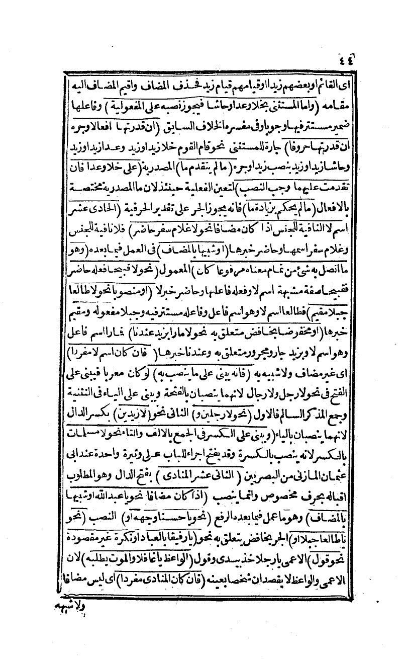 أي القائم أو بعضهم زيدا أو قيامهم قيام زيد فحذف المضاف وأقيم المضاف إليه مقامه (وأما المستثنى بخلا وعدا وحاشا فيجوز نصبه على المفعولية) وفاعلها ضمير مستتر فيها وجوبا وفي مفسره الخلاف السابق (أن قدرتها أفعالا وجره أن قدرتها حروفا) جارة للمستثنى (نحو قام القوم خلا زيدا وزيد وعدا زيدا وزيد وحشا زيدا وزيد بنصب زيدا وجره ما لم يتقدم ما المصدرية على خلا وعدا فإن تقدمت عليهما وجب النصب) لتعين الفعلية حينئذ لأن ما المصدرية مختصة بالأفعال (ما لم يحكم بزيادتها) فإنه يجوز الجر على تقدير الحرفية الحادي عشر (اسم لا النافية للجنس منصوب إذا كان مضافا نحو لا غلام سفر حاضر) فلا نافية للجنس وغلام سفرا سمها وحاضر خبرها (أو شبيها بالمضاف) في العمل فيما بعده (وهو ما اتصل به شيء من تمام معناه مرفوعا كان) المعمول (نحو لا قبيحا فعله حاضر) فقبيحا صفة مشبهة اسم لا وفعله فاعلها وحاضر خبر لا (أو منصوبا نحو لا طالعا جبلا مقيم) فطالعا اسم لا وهو اسم فاعل وفاعله مستتر فيه وجبلا مفعوله ومقيم خبرها (أو مخفوضا بخافض متعلق به نحو لا مارا بزيد عندنا) فمارا اسم فاعل وهو اسم لا ويزيد جار ومجرور ومتعلق به وعندنا خبرها (فإن كان اسم لا مفردا) أي غير مضاف ولا شبيه به (فإنه يبنى على ما ينصب به لو كان معربا) فيبنى على الفتح في نحو لا رجل ولا رجال لأنهما ينصبان بالفتحة ويبني على الياء في التثنية وجمع المذكر السالم فالأول (نحو لا رجلين و) الثاني نحو (لا زيدين) بكسر الدال لأنهما ينصبان الياء ويبنى على الكسر في الجمع بالألف والتاء نحو لا مسلمات بالكسر لأنه ينصب بالكسرة وقد يفتح إجراء للباب على وتيرة واحدة عند أبي عثمان المازني من البصريين الثاني عشر (المنادي ينصب) بفتح الدال وهو المطلوب أقباله بحرف مخصوص وإنما ينصب (إذا كان مضافا نحو يا عبد الله أو شبيها بالمضاف وهو ما عمل فيما بعده) الرفع (نحو يا حسنا وجهه أو) النصب (نحو يا طالعا جبلًا أو الجر) يخافض يتعلق به نحو (يا رفيقا بالعباد أو نكرة غير مقصودة نحو قول) الأعمى يا رجلا خذ بيدي وقول (الواعظ يا غافلا والموت يطلبه) لأن الأعمى والواعظ لا يقصدان شخصًا بعينه (فإن كان المنادي مفردا) أي ليس مضافا