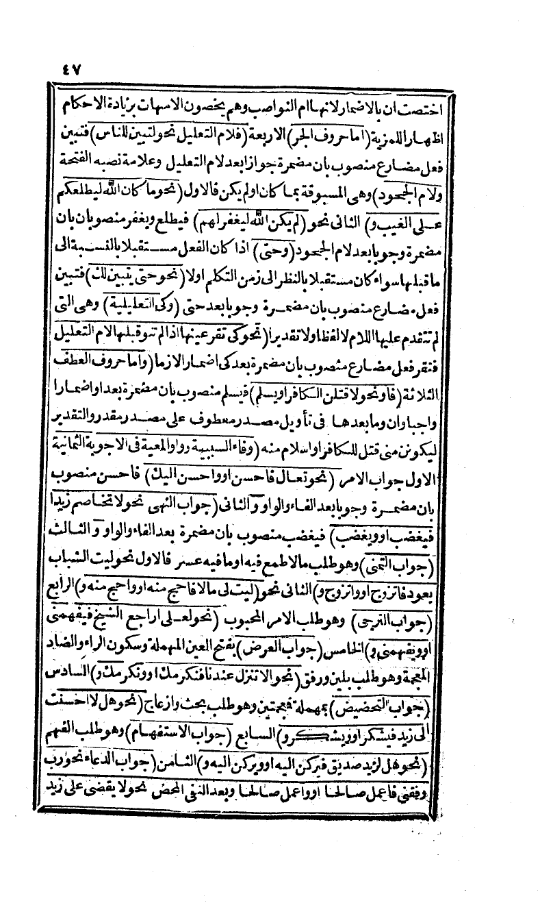 اختصت أن بالإضمار لأنها أم النواصب وهم يخصون الأمهات بزيادة الأحكام اظهار اللمزية (أما حروف الجر) الأربعة (فلام التعليل نحو لتبين للناس) فتبين فعل مضارع منصوب بأن مضمرة جوازا بعد لام التعليل وعلامة نصبه الفتحة ولام (الجحود) وهي المسبوقة بما كان أو لم يكن فالأول (نحو ما كان الله ليطلعكم على الغيب و) الثاني نحو (لم يكن الله ليغفر لهم) فيطلع ويغفر منصوبان بأن مضمرة وجوبا بعد لام الجحود (وحتى) إذا كان الفعل مستقبلا بالنسبة إلى ما قبلها سواء كان مستقبلا بالنظر إلى زمن التكلم أولا (نحو حتى يتبين لك) فتبين فعل مضارع منصوب بأن مضمرة وجوبا بعد حتى (وكي التعليلية) وهي التي لم تتقدم عليها اللام لا لفظا ولا تقديرًا (نحو كي تقر عينها إذا لم تنو قبلها لام التعليل) فنقر فعل مضارع منصوب بأن مضمرة بعد كي إضمار لازما (وأما حروف العطف) الثلاثة (فأو نحو لأقتلن الكافر أو يسلم) فيسلم منصوب بان مضمرة بعد أو اضمارا واجبا وأن وما بعدها في تأويل مصدر معطوف على مصدر مقدر والتقدير ليكونن مني قتل للكافر وإسلام منه (وفاء السببية وواو المعية في الأجوبة الثمانية) الأول (جواب الأمر نحو تعال فأحسن أو وأحسن إليك) فأحسن منصوب بأن مضمرة وجوبا بعد ألفا والواو والثاني (جواب النهي نحو لا تخاصم زيدًا فيغضب أو ويغضب) فيغضب منصوب بأن مضمرة بعد الفاء والواو والثالث (جواب التمني نحو ليت الشباب؟؟؟ أو وأتزوج ونحو: ليت لي مالًا فأحج منه، أو وأحج منه، و؟؟؟) وهو طلب الأمر المحبوب (نحو لعلى اراجع الشيخ فيفهمني أو ويفهمني و) الخامس (جواب العرض) بفتح العين المهملة المهملة وسكون الراء والضاد المعجمة وهو طلب بلين ورفق (نحو ألا تنزل عندنا فنكرمك أو ونكرمك و) السادس (جواب التحضيض) بمهملة فمعجمتين وهو طلب بحث وإزعاج (نحو هل لا احسنت إلى زيد فيشكرك أو يشكرك) السابع (وجواب الاستفهام) وهو طلب الفهم (نحو هل لزيد صديق فيركن إليه أو ويركن إليه و) الثامن (جواب الدعاء نحو رب وفقني فاعمل صالحا أو أعمل صالحا وبعد النفي المحض نحو لا يقضى على زيد