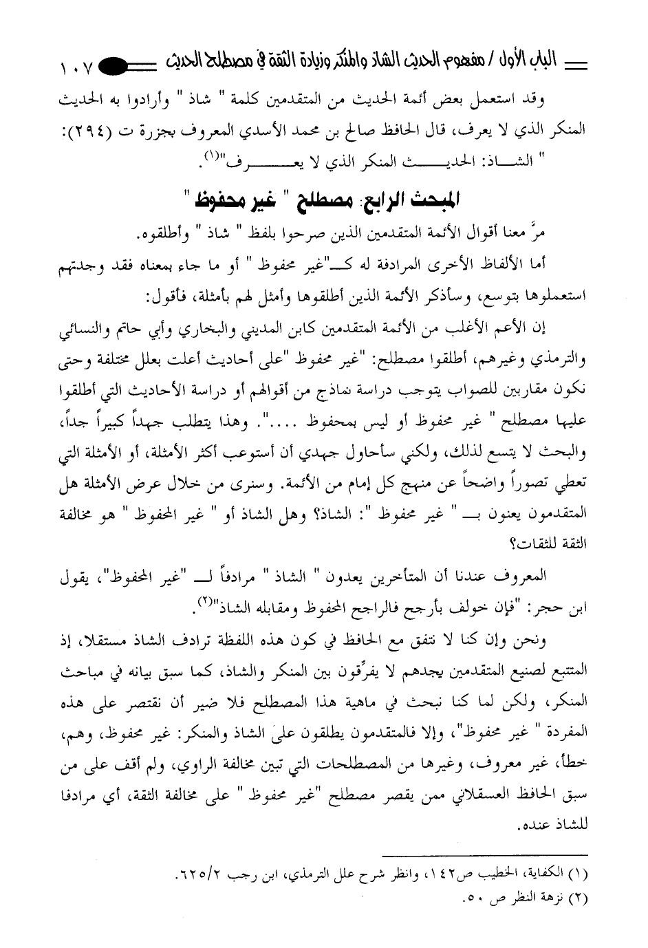 ونحن وإن كنا لا نتفق مع الحافظ في كون هذه اللفظة ترادف الشاذ مستقلا، إذ المتتبع لصنيع المتقدمين يجدهم لا يفرِّقون بين المنكر والشاذ، كما سبق بيانه في مباحث المنكر، ولكن لما كنا نبحث في ماهية هذا المصطلح فلا ضير أن نقتصر على هذه المفردة " غير محفوظ "، وإلا فالمتقدمون يطلقون على الشاذ والمنكر: غير محفوظ، وهم، خطأ، غير معروف، وغيرها من المصطلحات التي تبين مخالفة الراوي، ولم أقف على من سبق الحافظ العسقلاني ممن يقصر مصطلح "غير محفوظ " على مخالفة الثقة، أي مرادفا للشاذ عنده.