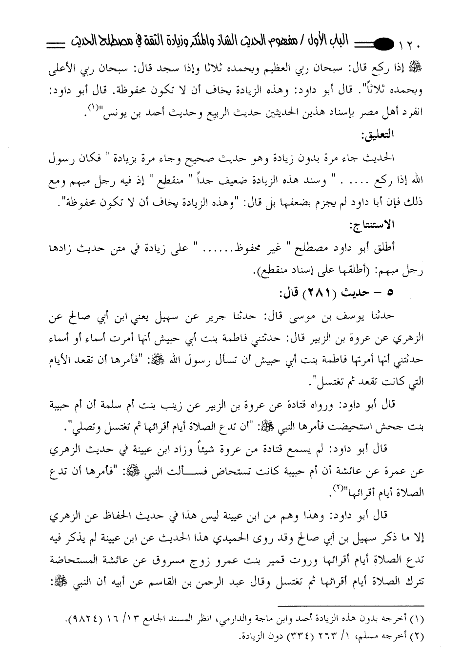 الاستنتاج: أطلق أبو داود مصطلح " غير محفوظ ... " على زيادة في متن حديث زادها رجل مبهم: (أطلقها على إسناد منقطع).
