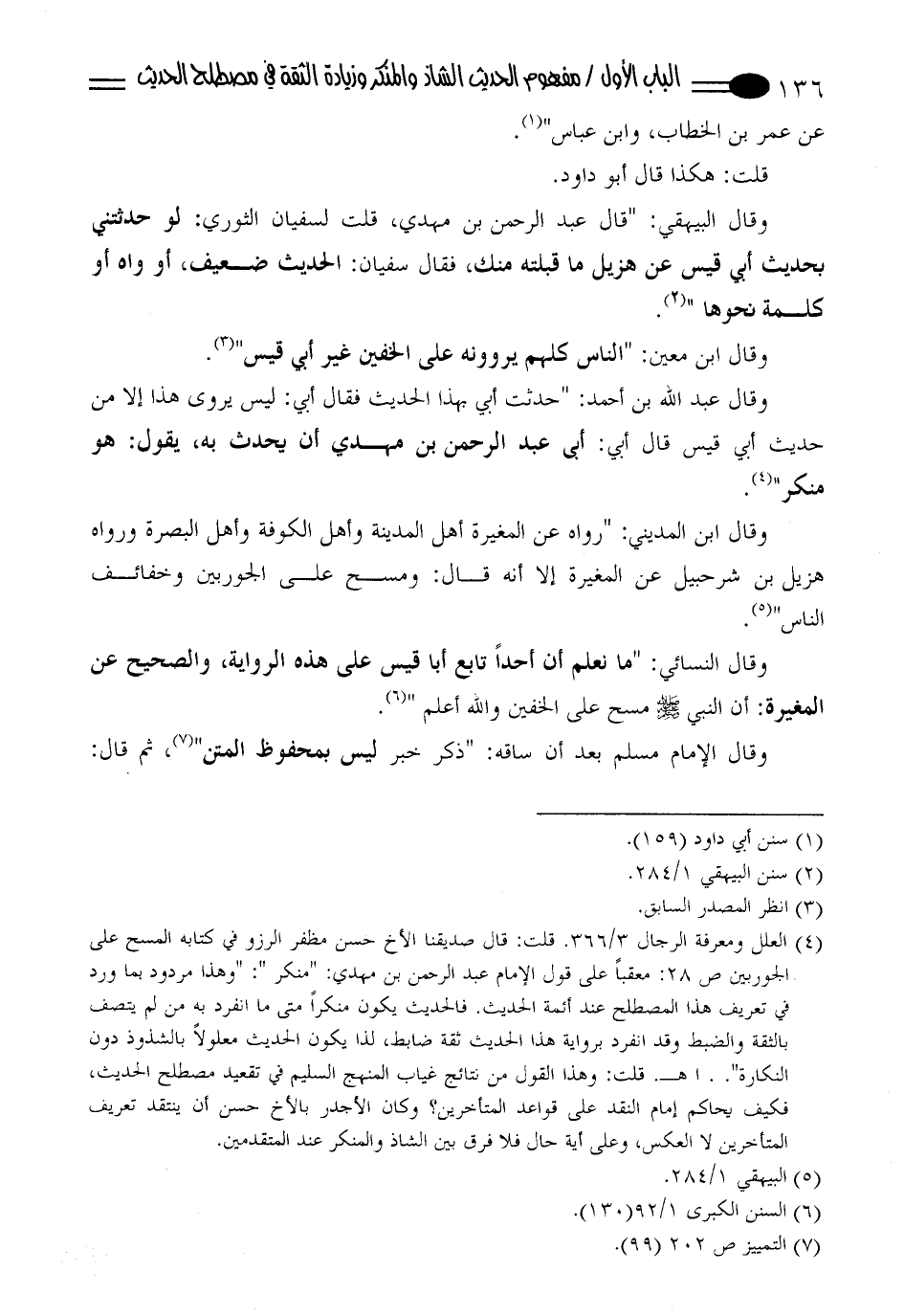 (¬4) العلل ومعرفة الرجال 3/ 366.قلت: قال صديقنا الأخ حسن مظفر الرزو في كتابه المسح على الجوربين ص 28: معقباً على قول الإمام عبد الرحمن بن مهدي:" منكر ": " وهذا مردود بما ورد في تعريف هذا المصطلح عند أئمة الحديث. فالحديث يكون منكراً متى ما انفرد به من لم يتصف بالثقة والضبط وقد انفرد برواية هذا الحديث ثقة ضابط، لذا يكون الحديث معلولاً بالشذوذ دون النكارة". .أ. هـ قلت: وهذا القول من نتائج غياب المنهج السليم في تقعيد مصطلح الحديث، فكيف يحاكم إمام النقد على قواعد المتأخرين؟ وكان الأجدر بالأخ حسن أن ينتقد تعريف المتأخرين لا العكس، وعلى أية حال فلا فرق بين الشاذ والمنكر عند المتقدمين.