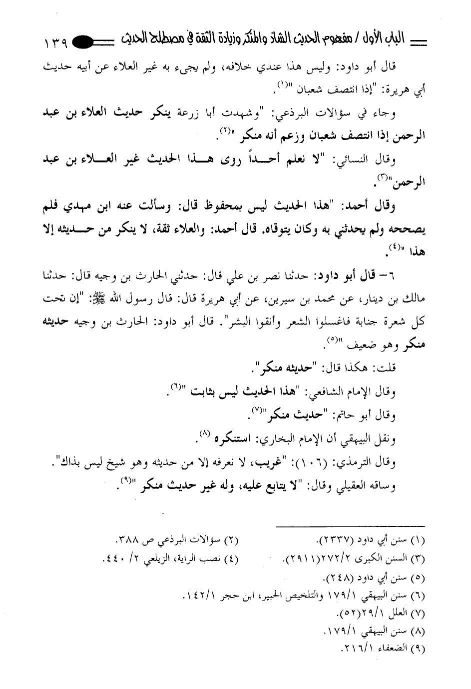 قال أبو داود: وليس هذا عندي خلافه، ولم يجىء به غير العلاء عن أبيه حديث أبي هريرة: " إذا انتصف شعبان " (¬1).