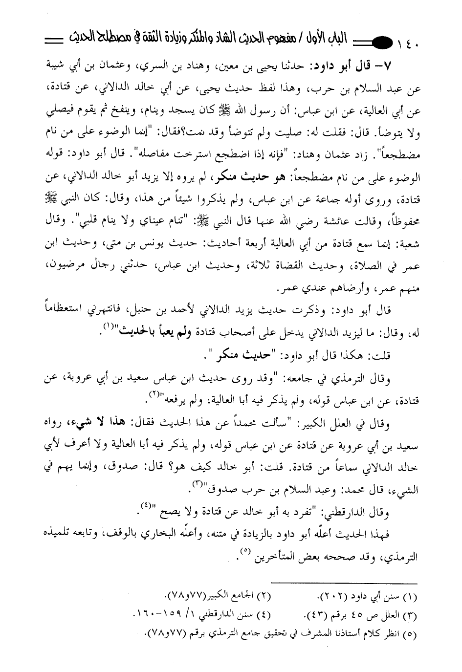 7 - قال أبو داود: حدثنا يحيى بن معين، وهناد بن السري، وعثمان بن أبي شيبة عن عبد السلام بن حرب، وهذا لفظ حديث يحيى، عن أبي خالد الدالاني، عن قتادة، عن أبي العالية، عن ابن عباس: أن رسول الله - صلى الله عليه وسلم - كان يسجد وينام، وينفخ ثم يقوم فيصلي ولا يتوضأ. قال: فقلت له: صليت ولم تتوضأ وقد نمت؟ فقال:" إنما الوضوء على من نام مضطجعاً ".زاد عثمان وهناد:" فإنه إذا اضطجع استرخت مفاصله ".قال أبو داود: قوله