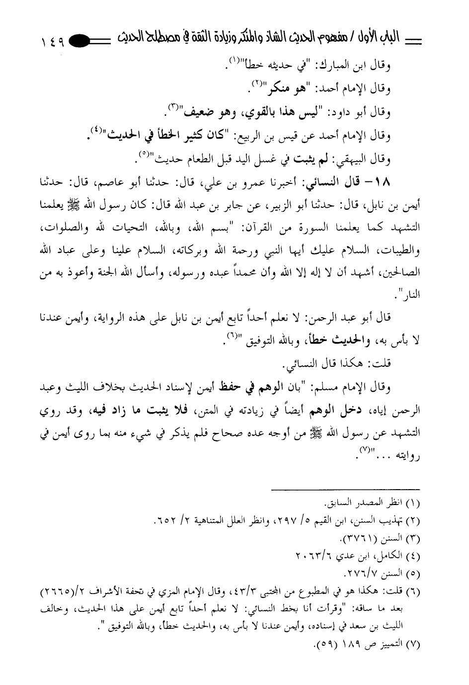 (¬6) قلت: هكذا هو في المطبوع من المجتبى 3/ 43، وقال الإمام المزي في تحفة الأشراف 2/ (2665) بعد ساقه: " وقرأت أنا بخط النسائي: لا نعلم أحداً تابع أيمن على هذا الحديث، وخالف الليث بن سعد في إسناده، وأيمن عندنا لا بأس به، والحديث خطأ، وبالله التوفيق ".