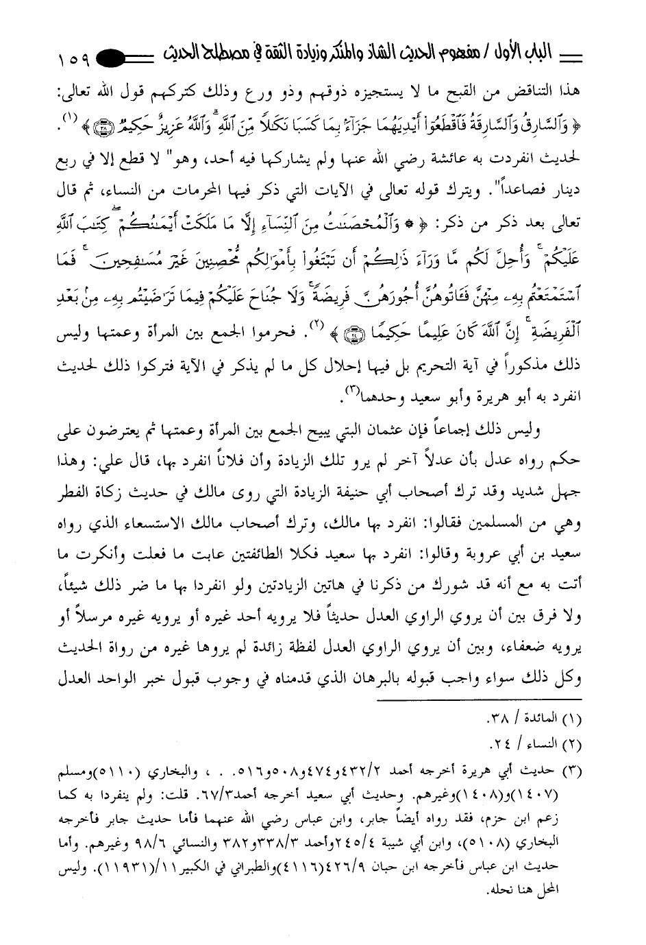 هذا التناقض من القبح ما لا يستجيزه ذوقهم وذو ورع وذلك كتركهم قول الله تعالى: "والسارقُ والسارقةُ فاقطعوا أيدَيَهما جزآءً بما كَسَبا نكالاً من الله والله عزيزٌ حكيم" (¬1). لحديث انفردت به عائشة رضي الله عنها ولم يشاركها فيه أحد، وهو" لا قطع إلا في ربع دينار فصاعداً ".ويترك قوله تعالى في الآيات التي ذكر فيها المحرمات من النساء، ثم قال تعالى بعد ذكر من ذكر: "والمحصناتُ من النساء إلا ما ملكت أيمانُكم كتابَ الله عليكم وُأحل لكم ما وراء ذلكم أن تبتغوا بأموالكم محصنينَ غيرَ مسافحين فما آستمتعتم به منهنَّ فآتوهنَّ أجورَهنَّ فريضةً ولا جناحَ عليكم فيما تراضيتم به من بعد الفريضة إنّ اللهَ كان عليماً حكيماً" (¬2). فحرموا الجمع بين المرأة وعمتها وليس ذلك مذكوراً في آية التحريم بل فيها إحلال كل ما لم يذكر في الآية فتركوا ذلك لحديث انفرد به أبو هريرة وأبو سعيد وحدهما. (¬3)