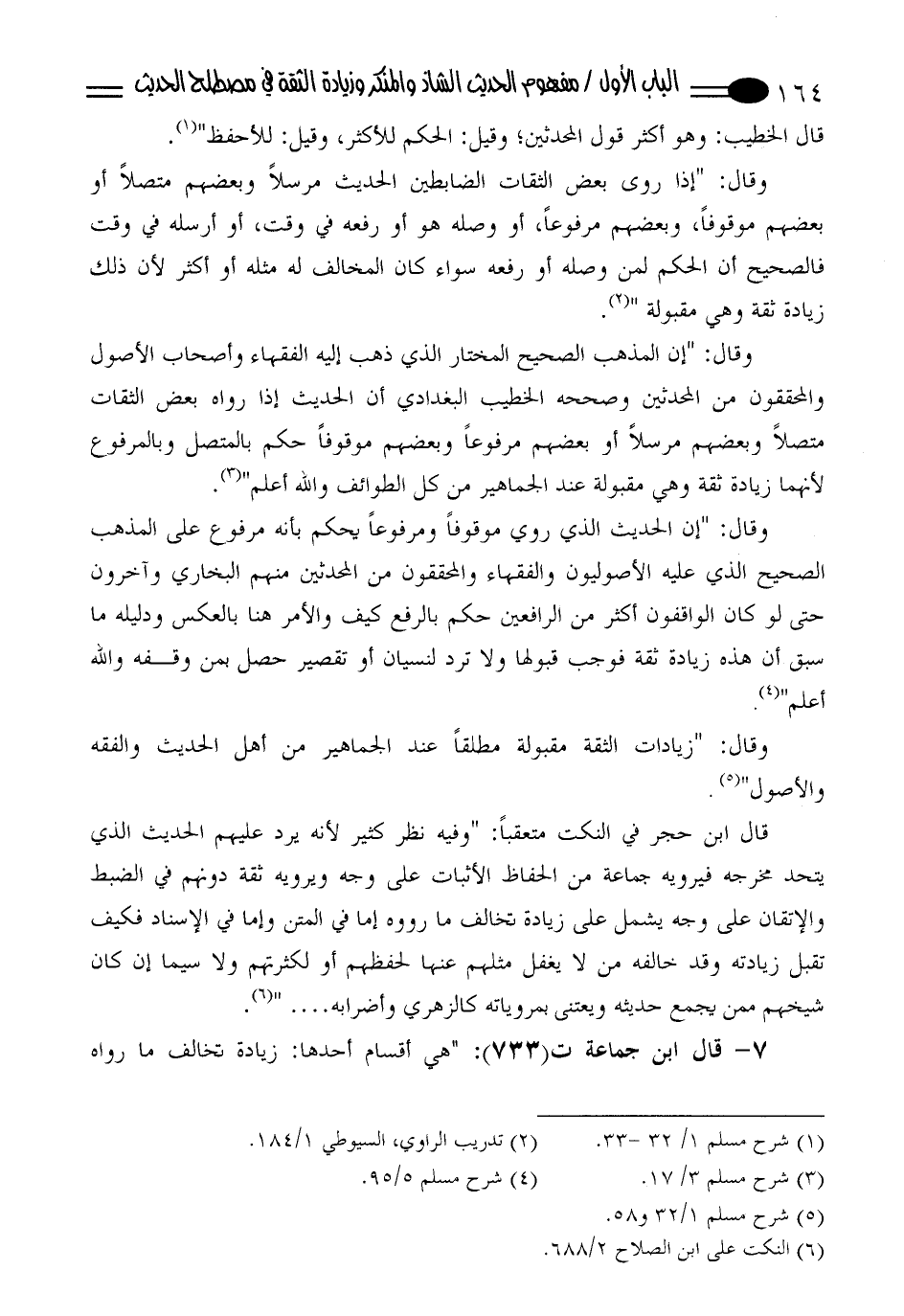 وقال:"إن المذهب الصحيح المختار الذي ذهب إليه الفقهاء وأصحاب الأصول والمحققون من المحدثين وصححه الخطيب البغدادي أن الحديث إذا رواه بعض الثقات متصلاً وبعضهم مرسلاً أو بعضهم مرفوعاً وبعضهم موقوفاً حكم بالمتصل وبالمرفوع لأنهما زيادة ثقة وهى مقبولة عند الجماهير من كل الطوائف والله أعلم ". (¬3)