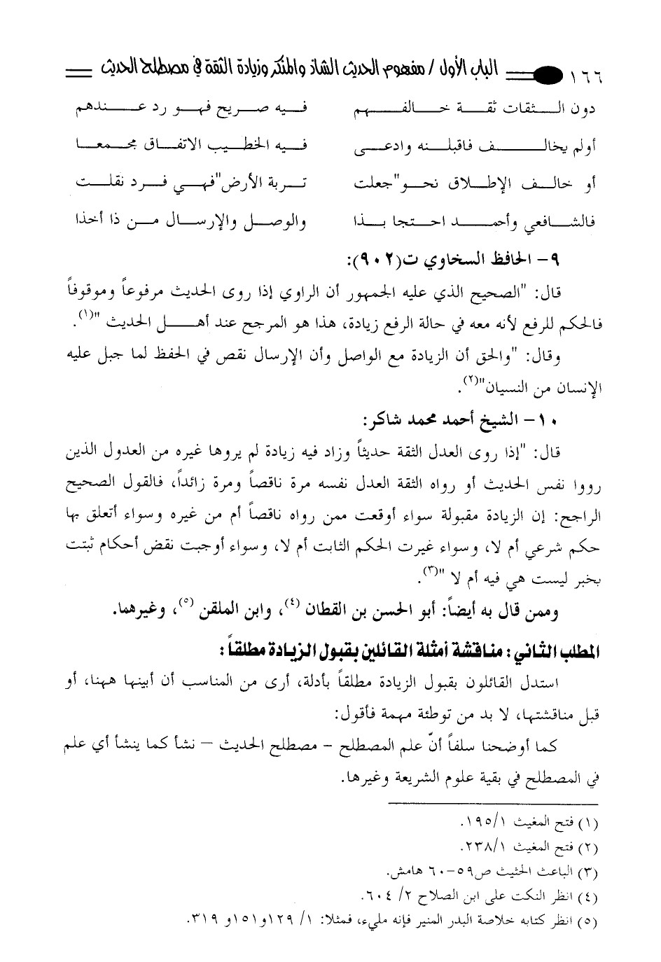 قال:"إذا روى العدل الثقة حديثاً وزاد فيه زيادة لم يروها غيره من العدول الذين رووا نفس الحديث أو رواه الثقة العدل نفسه مرة ناقصاً ومرة زائداً، فالقول الصحيح الراجح: إن الزيادة مقبولة سواء أوقعت ممن رواه ناقصاً أم من غيره وسواء أتعلق بها حكم شرعي أم لا، وسواء غيرت الحكم الثابت أم لا، وسواء أوجبت نقض أحكام ثبتت بخبر ليست هي فيه أم لا " (¬3).