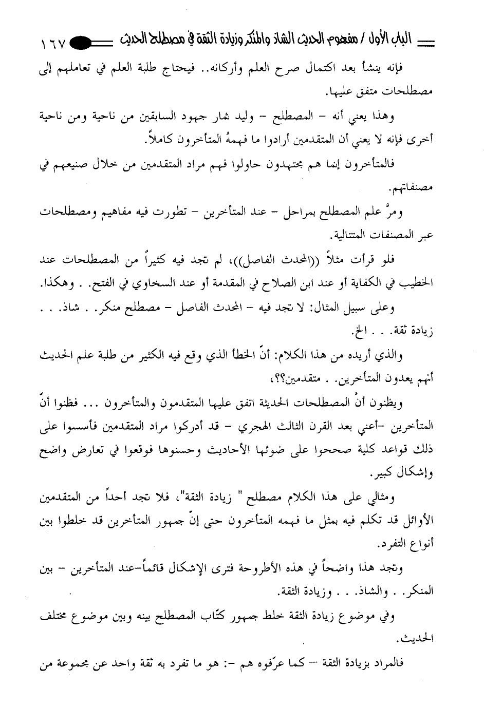 ومثالي على هذا الكلام مصطلح " زيادة الثقة "،فلا تجد أحداً من المتقدمين الأوائل قد تكلم فيه بمثل ما فهمه المتأخرون حتى إنّ جمهور المتأخرين قد خلطوا بين أنواع التفرد.
