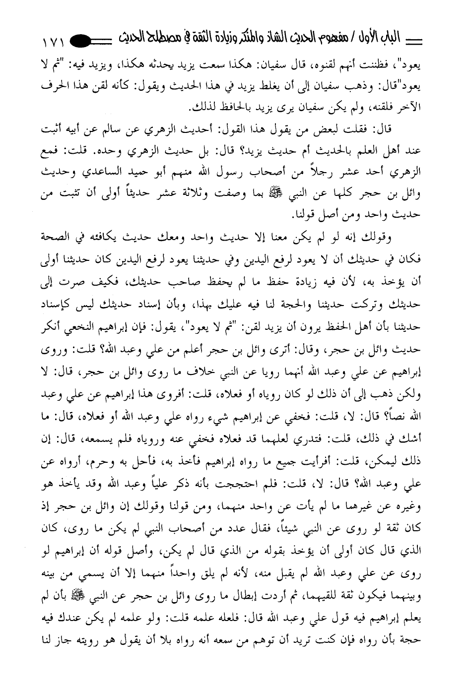 وقولك أنه لو لم يكن معنا إلا حديث واحد ومعك حديث يكافئه في الصحة فكان في حديثك أن لا يعود لرفع اليدين وفي حديثنا يعود لرفع اليدين كان حديثنا أولى أن يؤخذ به، لأن فيه زيادة حفظ مالم يحفظ صاحب حديثك، فكيف صرت إلى حديثك وتركت حديثنا والحجة لنا فيه عليك بهذا، وبأن إسناد حديثك ليس كإسناد حديثنا بأن أهل الحفظ يرون أن يزيد لقن:"ثم لا يعود"، يقول: فإن إبراهيم النخعي أنكر حديث وائل بن