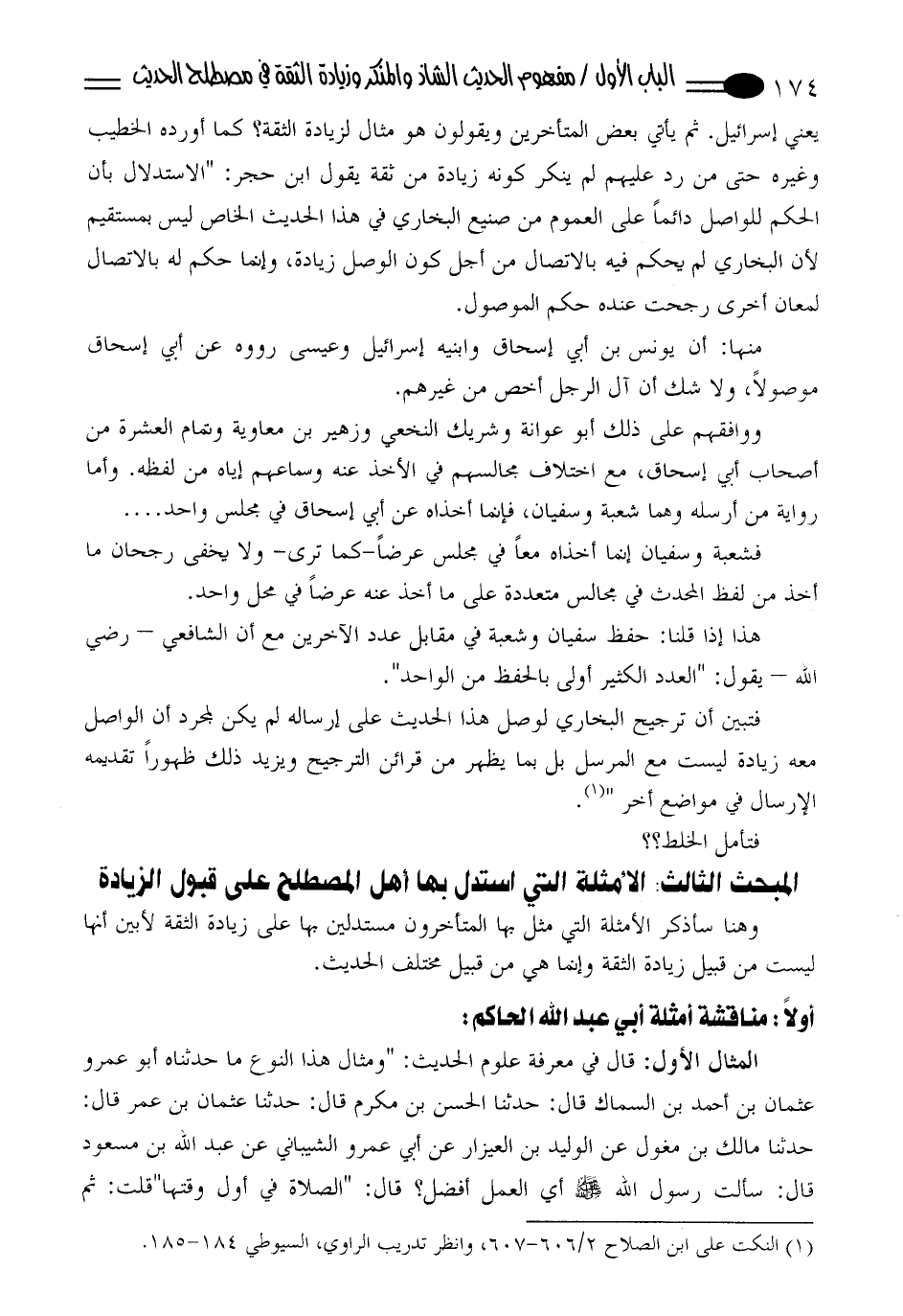 يعني إسرائيل. ثم يأتي بعض المتأخرين ويقولون هو مثال لزيادة الثقة؟ كما أورده الخطيب وغيره حتى من رد عليهم لم ينكر كونه زيادة من ثقة يقول ابن حجر:"الاستدلال بأن الحكم للواصل دائماً على العموم من صنيع البخاري في هذا الحديث الخاص ليس بمستقيم لأن البخاري لم يحكم فيه بالاتصال من أجل كون الوصل زيادة، وإنما حكم له بالاتصال لمعان أخرى رجحت عنده حكم الموصول.