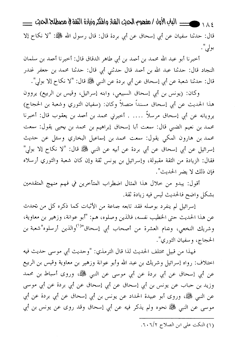 وكان: (يونس بن أبي إسحاق السبيعي، وابنه إسرائيل، وقيس بن الربيع) يروون هذا الحديث عن أبي إسحاق مسنداً متصلاً وكان: (سفيان الثوري وشعبة بن الحجاج) يرويانه عن أبي إسحاق مرسلاً ... .. أخبرني محمد بن أحمد بن يعقوب قال: أخبرنا محمد بن نعيم الضبي قال: سمعت أبا إسحاق إبراهيم بن محمد بن يحيى يقول: سمعت محمد بن هارون المكي يقول: سمعت محمد بن إسماعيل البخاري وسئل عن حديث إسرائيل عن أبي إسحاق عن أبي بردة عن أبيه عن النبي - صلى الله عليه وسلم - قال:" لا نكاح إلا بولي" فقال: الزيادة من الثقة مقبولة، وإسرائيل بن يونس ثقة وان كان شعبة والثوري أرسلاه فإن ذلك لا يضر الحديث ".
