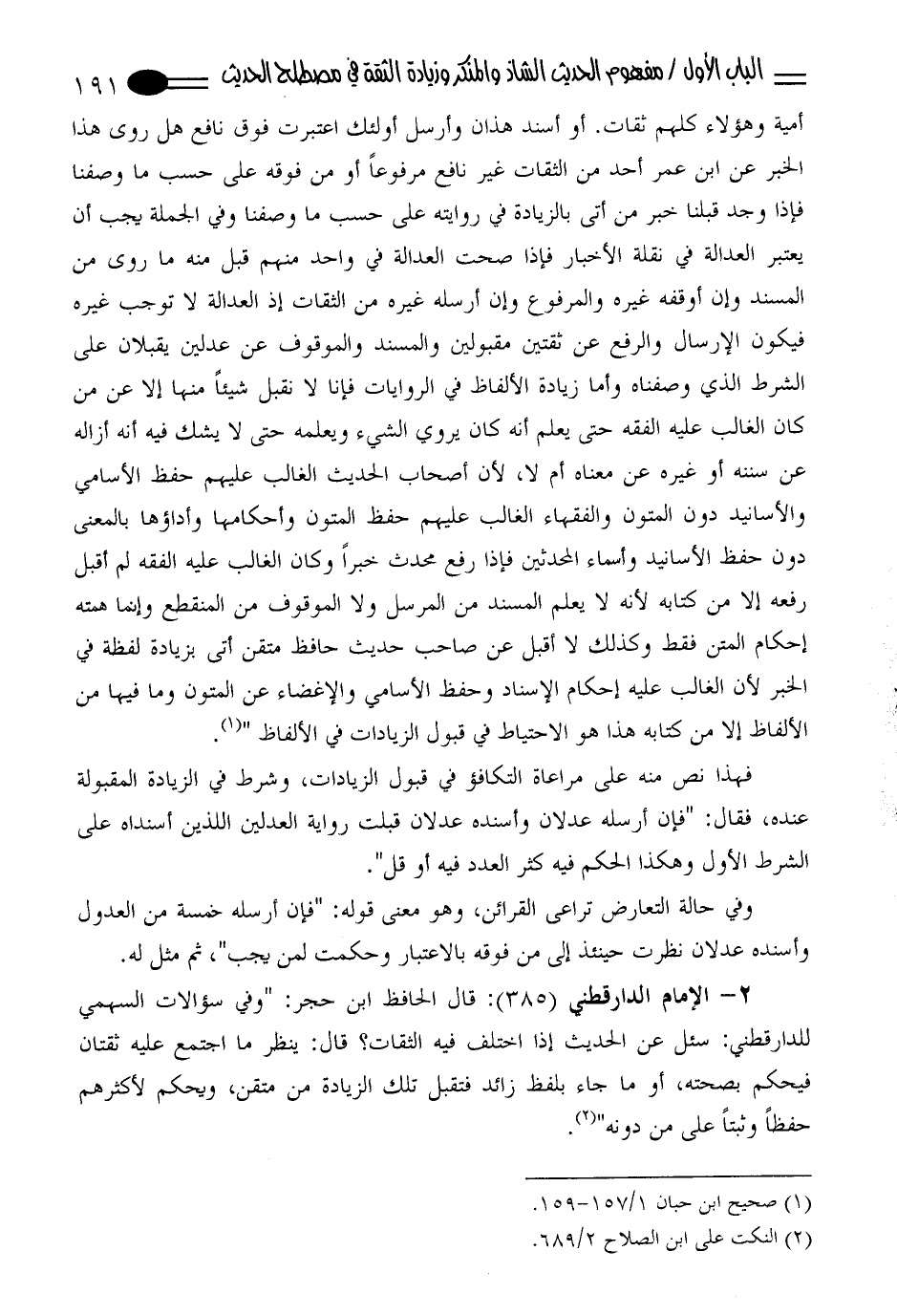 2 - الإمام الدارقطني (385): قال الحافظ ابن حجر:"وفي سؤالات السهمي للدارقطني: سئل عن الحديث إذا اختلف فيه الثقات؟ قال: ينظر ما اجتمع عليه ثقتان فيحكم بصحته، أو ما جاء بلفظ زائد فتقبل تلك الزيادة من متقن، ويحكم لأكثرهم حفظاً وثبتاً على من دونه" (¬2).