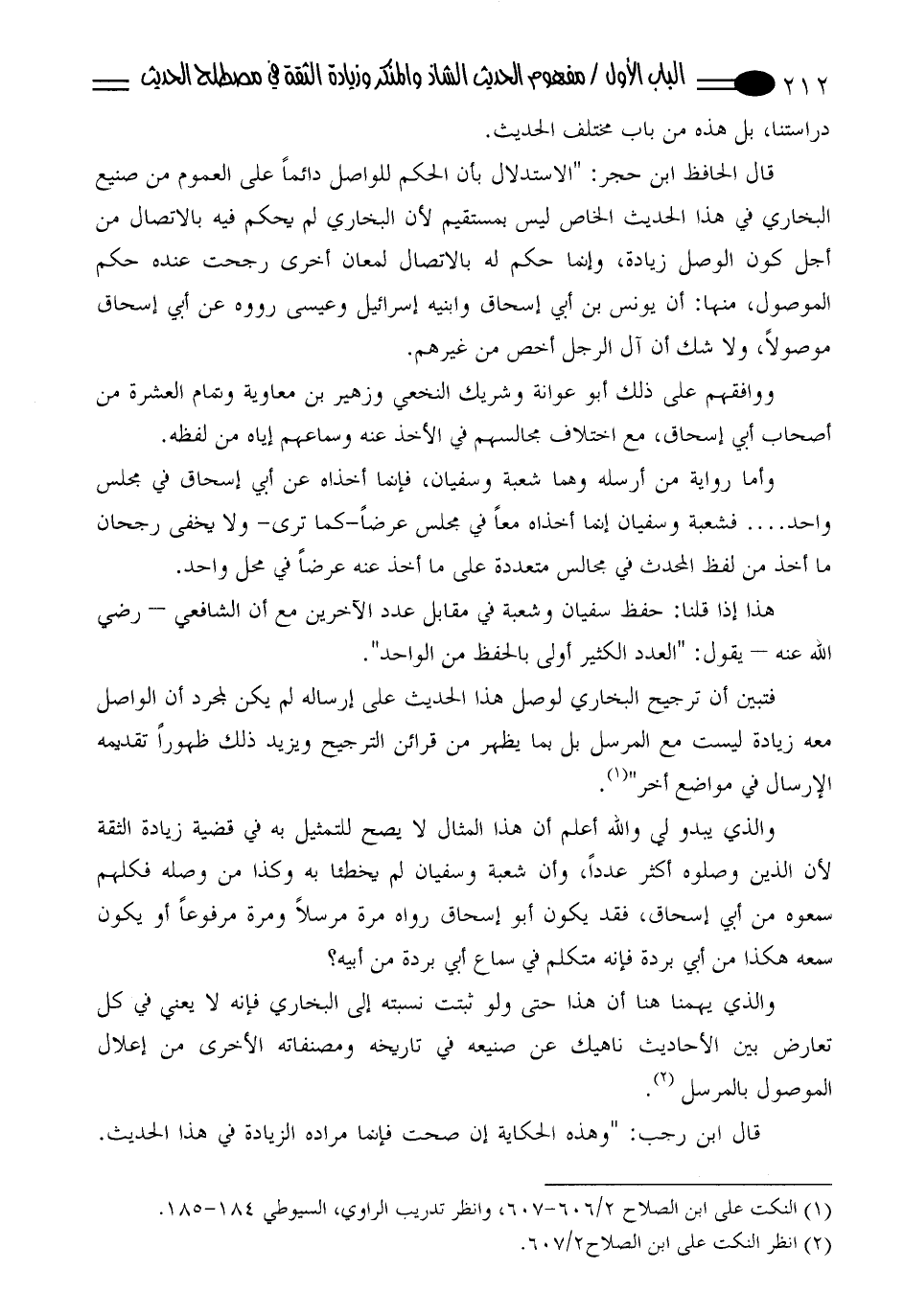 قال الحافظ ابن حجر: " الاستدلال بأن الحكم للواصل دائماً على العموم من صنيع البخاري في هذا الحديث الخاص ليس بمستقيم لأن البخاري لم يحكم فيه بالاتصال من أجل كون الوصل زيادة، وإنما حكم له بالاتصال لمعان أخرى رجحت عنده حكم الموصول، منها: أن يونس بن أبي إسحاق وابنيه إسرائيل وعيسى رووه عن أبي إسحاق موصولاً، ولا شك أن آل الرجل أخص من غيرهم.