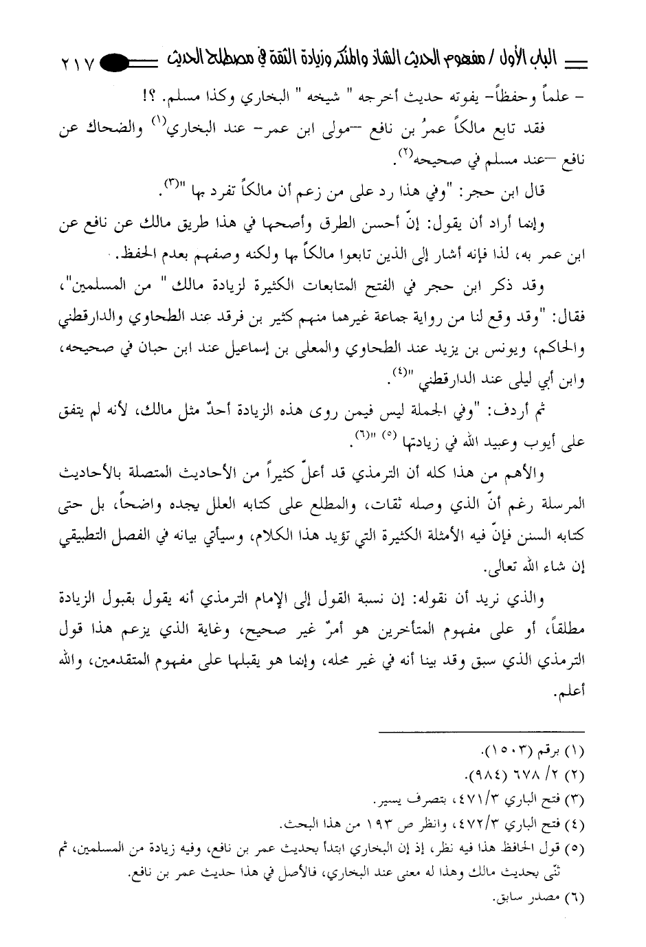 والذي نريد أن نقوله: أن نسبة القول إلى الإمام الترمذي أنه يقول بقبول الزيادة مطلقاً، أو على مفهوم المتأخرين هو أمرٌ غير صحيح، وغاية الذي يزعم هذا قول الترمذي الذي سبق وقد بينا أنه في غير محله، وإنما هو يقبلها على مفهوم المتقدمين، والله أعلم.