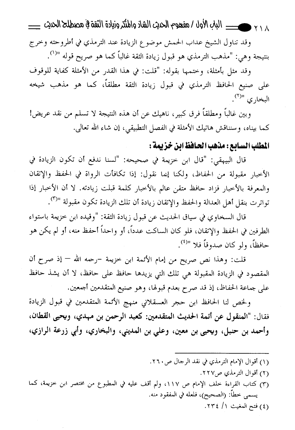قلت: وهذا نص صريح من إمام الأئمة ابن خزيمة -رحمه الله - إذ صرح أن المقصود في الزيادة المقبولة هي تلك التي يزيدها حافظ على حافظ، لا أن يشذ حافظ على جماعة الحفاظ، إذ قد صرح بعدم قبولها، وهو صنيع المتقدمين أجمعين.
