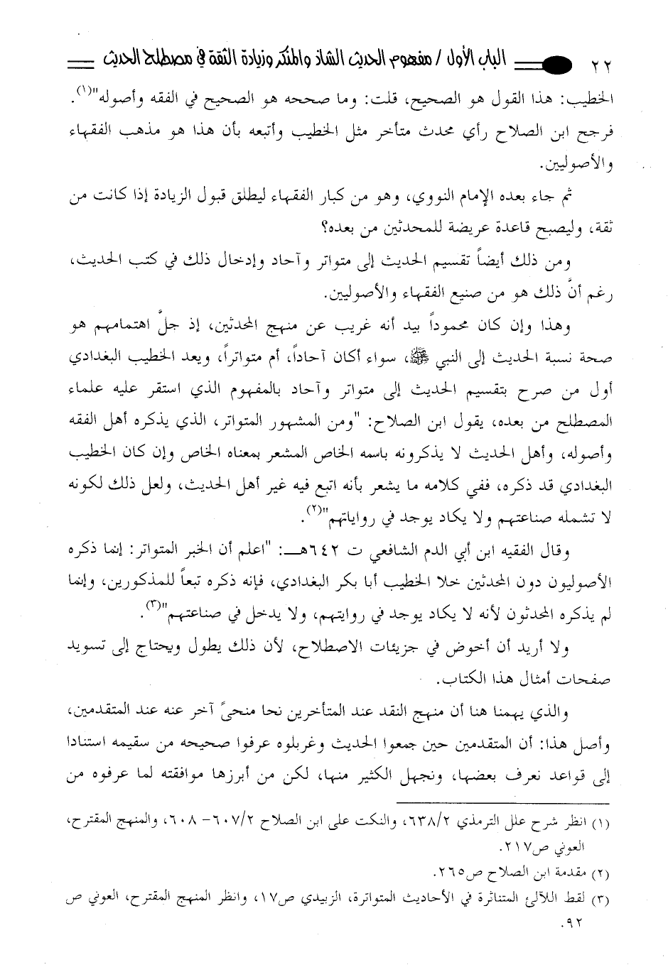 وهذا وإن كان محموداً بيد أنه غريب عن منهج المحدثين، إذ جلَّ اهتمامهم هو صحة نسبة الحديث إلى النبي - صلى الله عليه وسلم -، سواء أكان آحاداً، أم متواتراً، ويعد الخطيب البغدادي أول من صرح بتقسيم الحديث إلى متواتر وآحاد بالمفهوم الذي استقر عليه علماء المصطلح من بعده، يقول ابن الصلاح: " ومن المشهور المتواتر، الذي يذكره أهل الفقه وأصوله، وأهل الحديث لا يذكرونه باسمه الخاص المشعر بمعناه الخاص وإن كان الخطيب البغدادي قد ذكره، ففي كلامه ما يشعر بأنه اتبع فيه غير أهل الحديث، ولعل ذلك لكونه لا تشمله صناعتهم ولا يكاد يوجد في رواياتهم" (¬2).