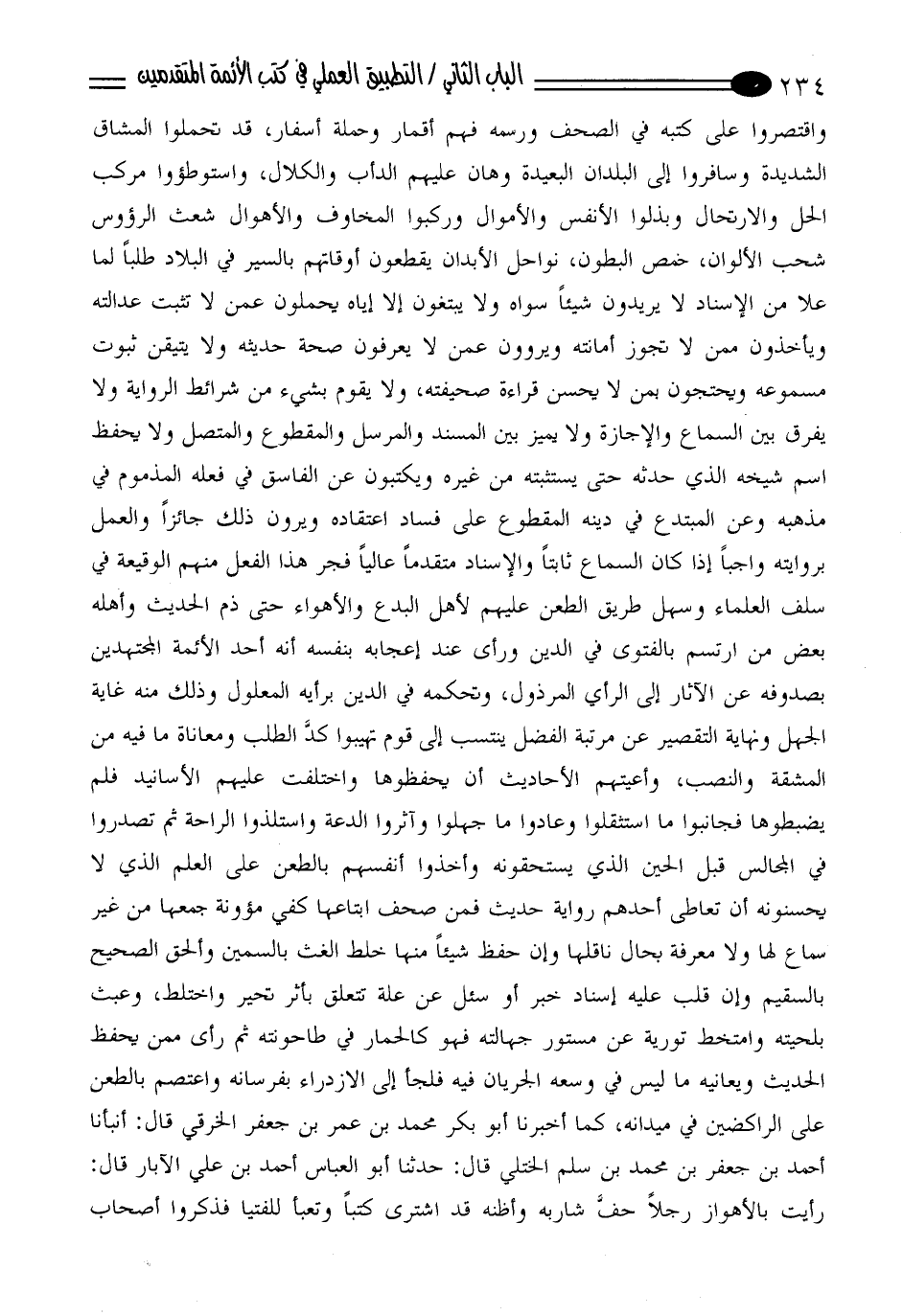 الحل والارتحال وبذلوا الأنفس والأموال وركبوا المخاوف والأهوال شعث الرؤوس شحب الألوان، خمص البطون، نواحل الابدان يقطعون أوقاتهم بالسير في البلاد طلباً لما علا من الإسناد لا يريدون شيئاً سواه ولا يبتغون إلا إياه يحملون عمن لا تثبت عدالته ويأخذون ممن لا تجوز أمانته ويروون عمن لا يعرفون صحة حديثه ولا يتيقن ثبوت مسموعه ويحتجون بمن لا يحسن قراءة صحيفته، ولا يقوم بشيء من شرائط الرواية ولا يفرق بين السماع والإجازة ولا يميز بين المسند والمرسل والمقطوع والمتصل ولا يحفظ اسم شيخه الذي حدثه حتى يستثبته من غيره ويكتبون عن الفاسق في فعله المذموم في مذهبه وعن المبتدع في دينه المقطوع على فساد اعتقاده ويرون ذلك جائزاً والعمل بروايته واجباً إذا كان السماع ثابتاً والإسناد متقدماً عالياً فجر هذا الفعل منهم الوقيعة في سلف العلماء وسهل طريق الطعن عليهم لأهل البدع والأهواء حتى ذم الحديث وأهله بعض من ارتسم بالفتوى في الدين ورأى عند إعجابه بنفسه انه أحد الأئمة المجتهدين بصدوفه عن الآثار إلى الرأي المرذول، وتحكمه في الدين برأيه المعلول وذلك منه غاية الجهل ونهاية التقصير عن مرتبة الفضل ينتسب إلى قوم تهيبوا كد الطلب ومعاناة ما فيه من المشقة والنصب، وأعيتهم الأحاديث أن يحفظوها واختلفت عليهم الأسانيد فلم يضبطوها فجانبوا ما استثقلوا وعادوا ما جهلوا وآثروا الدعة واستلذوا الراحة ثم تصدروا في المجالس قبل الحين الذي يستحقونه وأخذوا أنفسهم بالطعن على العلم الذي لا يحسنونه أن تعاطى أحدهم رواية حديث فمن صحف ابتاعها كفي مؤونة جمعها من غير سماع لها ولا معرفة بحال ناقلها وإن حفظ شيئاً منها خلط الغث بالسمين وألحق الصحيح بالسقيم وإن قلب عليه إسناد خبر أو سئل عن علة تتعلق بأثر تحير واختلط، وعبث بلحيته وامتخط تورية عن مستور جهالته فهو كالحمار في طاحونته ثم رأى ممن يحفظ الحديث ويعانيه ما ليس في وسعه الجريان فيه فلجأ إلى الازدراء بفرسانه واعتصم بالطعن على الراكضين في ميدانه، كما أخبرنا أبو بكر محمد بن عمر بن جعفر الخرقي قال: أنبأنا أحمد بن جعفر بن محمد بن سلم الختلي قال: حدثنا أبو العباس أحمد بن علي الآبار قال: رأيت بالأهواز رجلاً حف شاربه وأظنه قد اشترى كتباً وتعبأ للفتيا فذكروا أصحاب