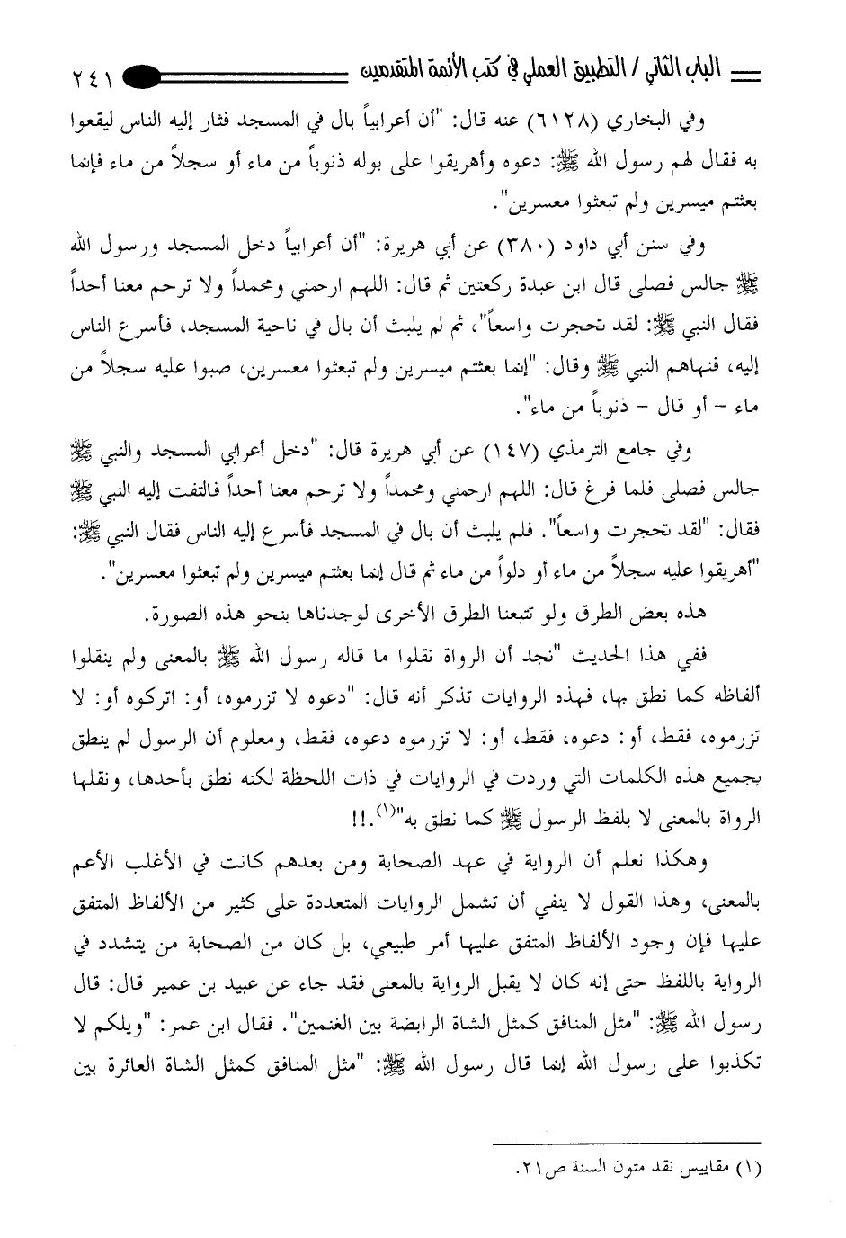 ففي هذا الحديث "نجد أن الرواة نقلوا ما قاله رسول الله - صلى الله عليه وسلم - بالمعنى ولم ينقلوا ألفاظه كما نطق بها، فهذه الروايات تذكر أنه قال: " دعوه لا تزرموه، أو: اتركوه أو: لا تزرموه، فقط، أو: دعوه، فقط، أو: لا تزرموه دعوه، فقط، ومعلوم أن الرسول لم ينطق بجميع هذه الكلمات التي وردت في الروايات في ذات اللحظة لكنه نطق بأحدها، ونقلها الرواة بالمعنى لا بلفظ الرسول - صلى الله عليه وسلم - كما نطق به ". (¬1)!!