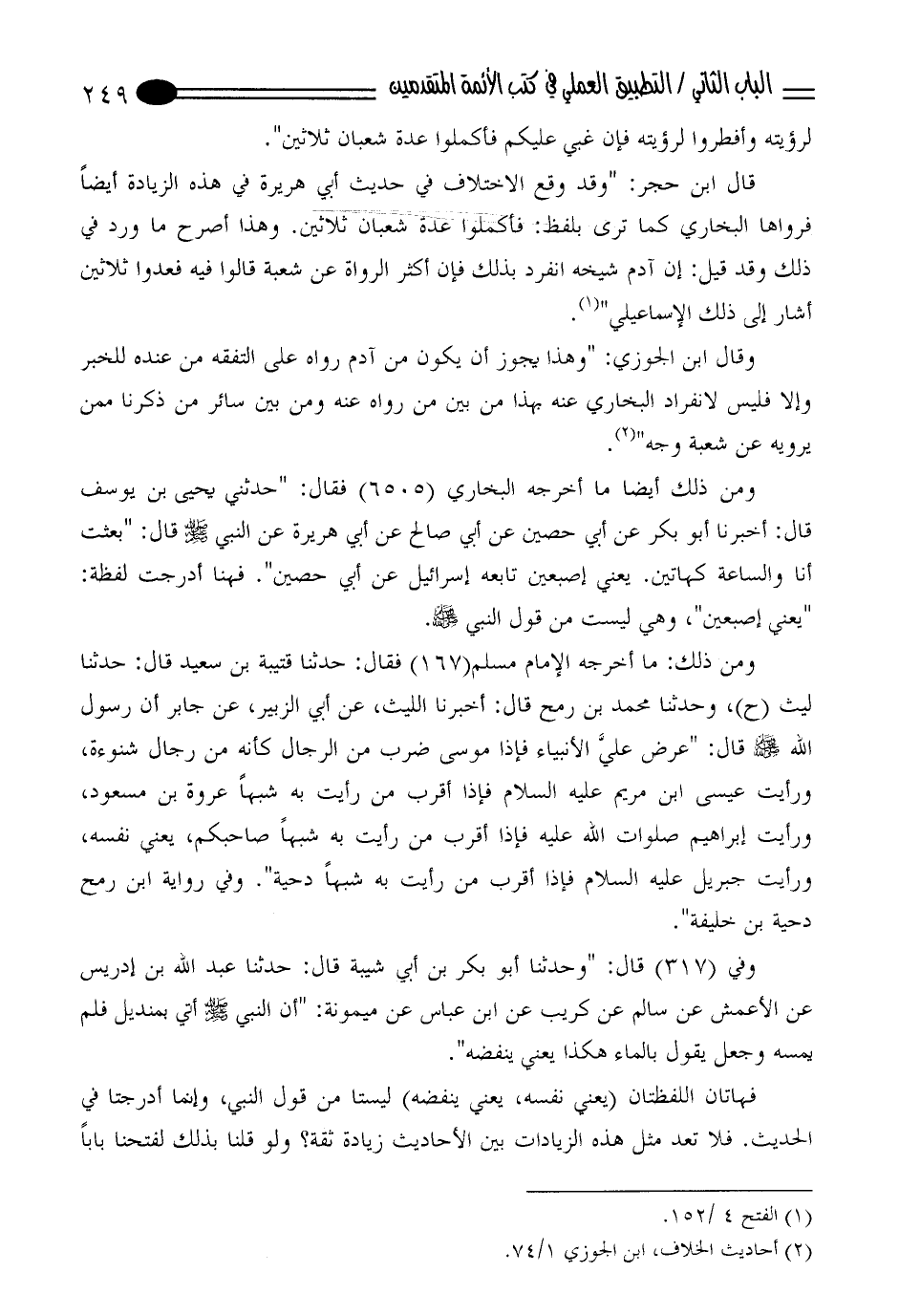 قال ابن حجر: " وقد وقع الاختلاف في حديث أبي هريرة في هذه الزيادة أيضاً فرواها البخاري كما ترى بلفظ: فأكملوا عدة شعبان ثلاثين. وهذا أصرح ما ورد في ذلك وقد قيل: إن آدم شيخه انفرد بذلك فإن أكثر الرواة عن شعبة قالوا فيه فعدوا ثلاثين أشار إلى ذلك الإسماعيلي ". (¬1)