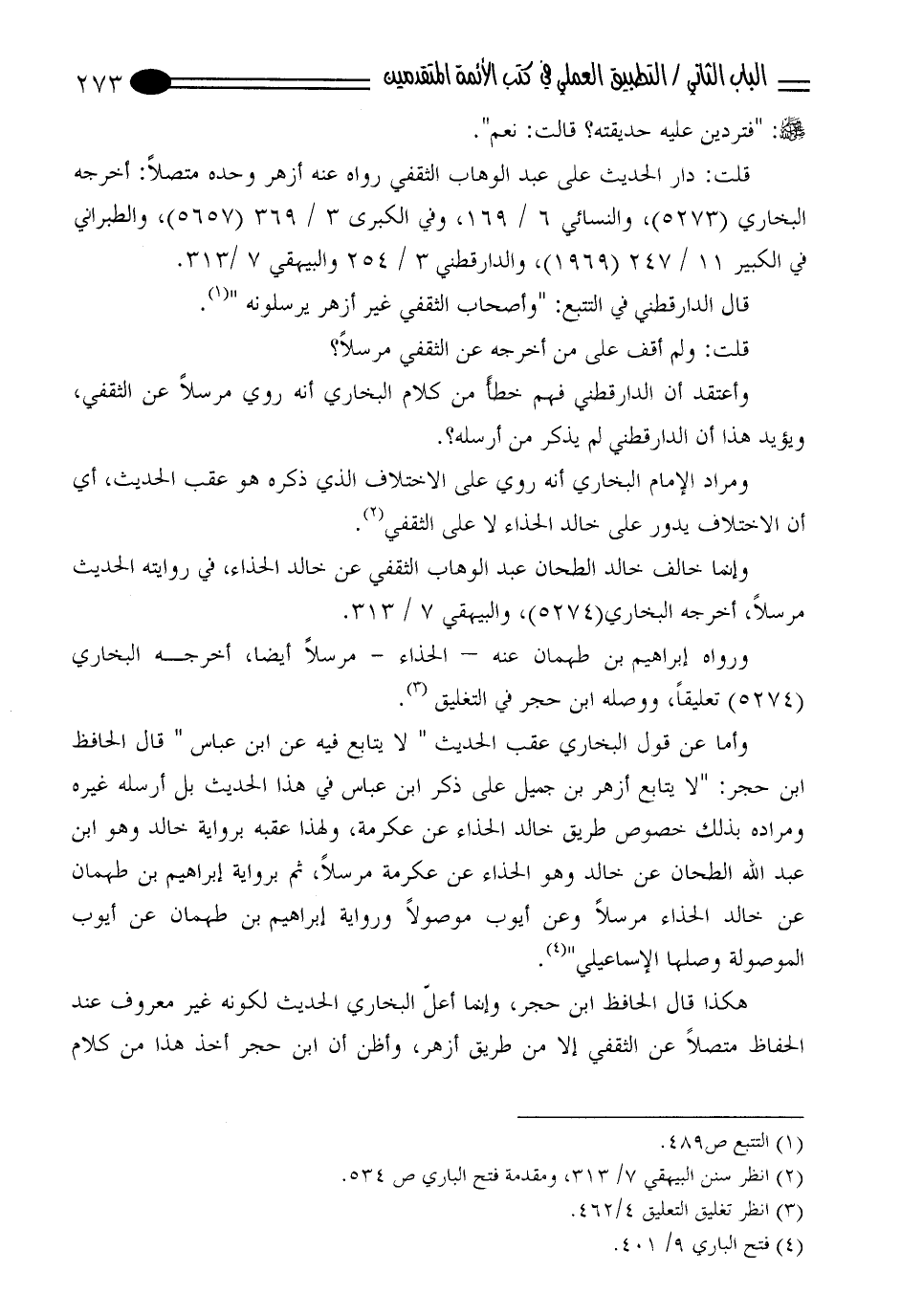 وأعتقد أن الدارقطني فهم خطأً من كلام البخاري أنه روي مرسلاً عن الثقفي، ويؤيد هذا أن الدارقطني لم يذكر من أرسله؟.