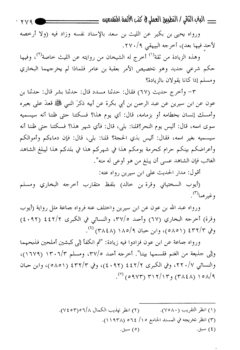 ورواه عبد الله بن عون عن ابن سيرين واختلف عنه فرواه جماعة مثل رواية (أيوب وقرة) أخرجه البخاري (67) وأحمد 5/ 37، والنسائي في الكبرى 2/ 442 (4092) وفي 3/ 432 (5851)، وابن حبان 9/ 185 (3848) (¬4).