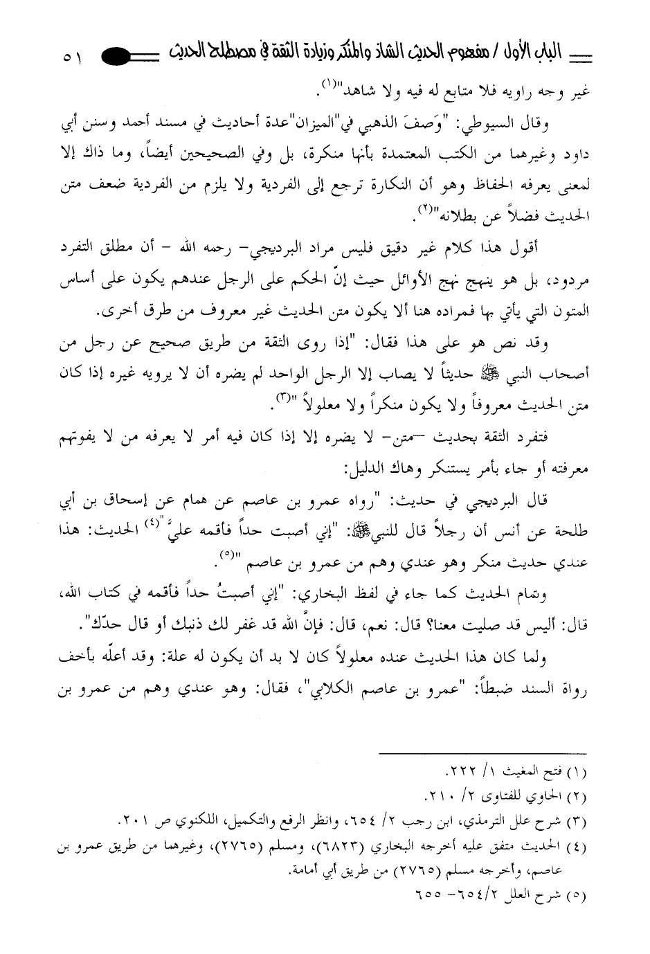 وقال السيوطي: "وَصفَ الذهبي في"الميزان"عدة أحاديث في مسند أحمد وسنن أبي داود وغيرهما من الكتب المعتمدة بأنها منكرة، بل وفي الصحيحين أيضاً، وما ذاك إلا لمعنى يعرفه الحفاظ وهو أن النكارة ترجع إلى الفردية ولا يلزم من الفردية ضعف متن الحديث فضلاً عن بطلانه" (¬2).