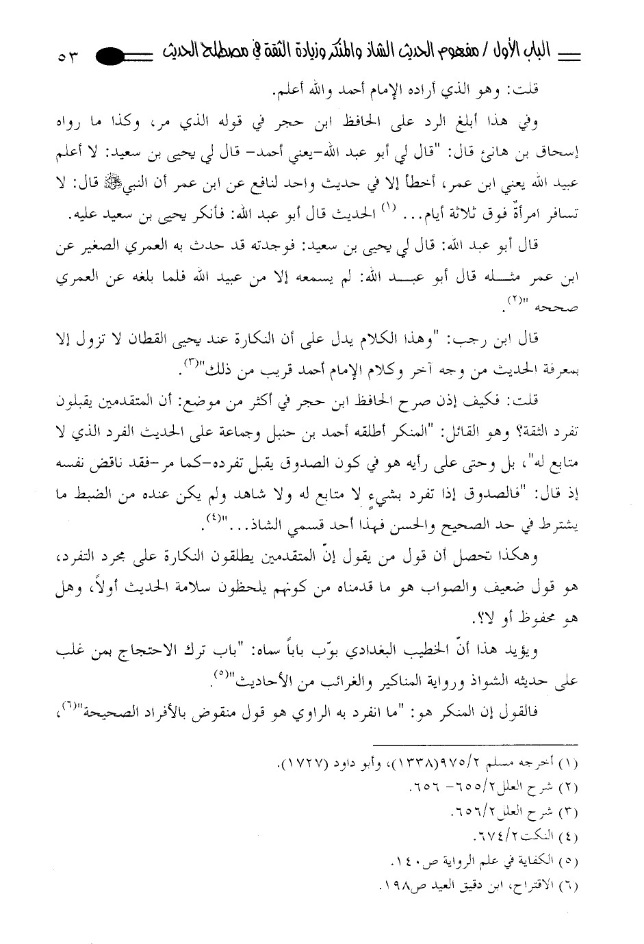 قلت: فكيف إذن صرح الحافظ ابن حجر في أكثر من موضع: أن المتقدمين يقبلون تفرد الثقة؟ وهو القائل:" المنكر أطلقه أحمد بن حنبل وجماعة على الحديث الفرد الذي لا متابع له "، بل وحتى على رأيه هو في كون الصدوق يقبل تفرده-كما مر-فقد ناقض نفسه إذ قال:"فالصدوق إذا تفرد بشيءٍ لا متابع له ولا شاهد ولم يكن عنده من الضبط ما يشترط في حد الصحيح والحسن فهذا أحد قسمي الشاذ ... ". (¬4)