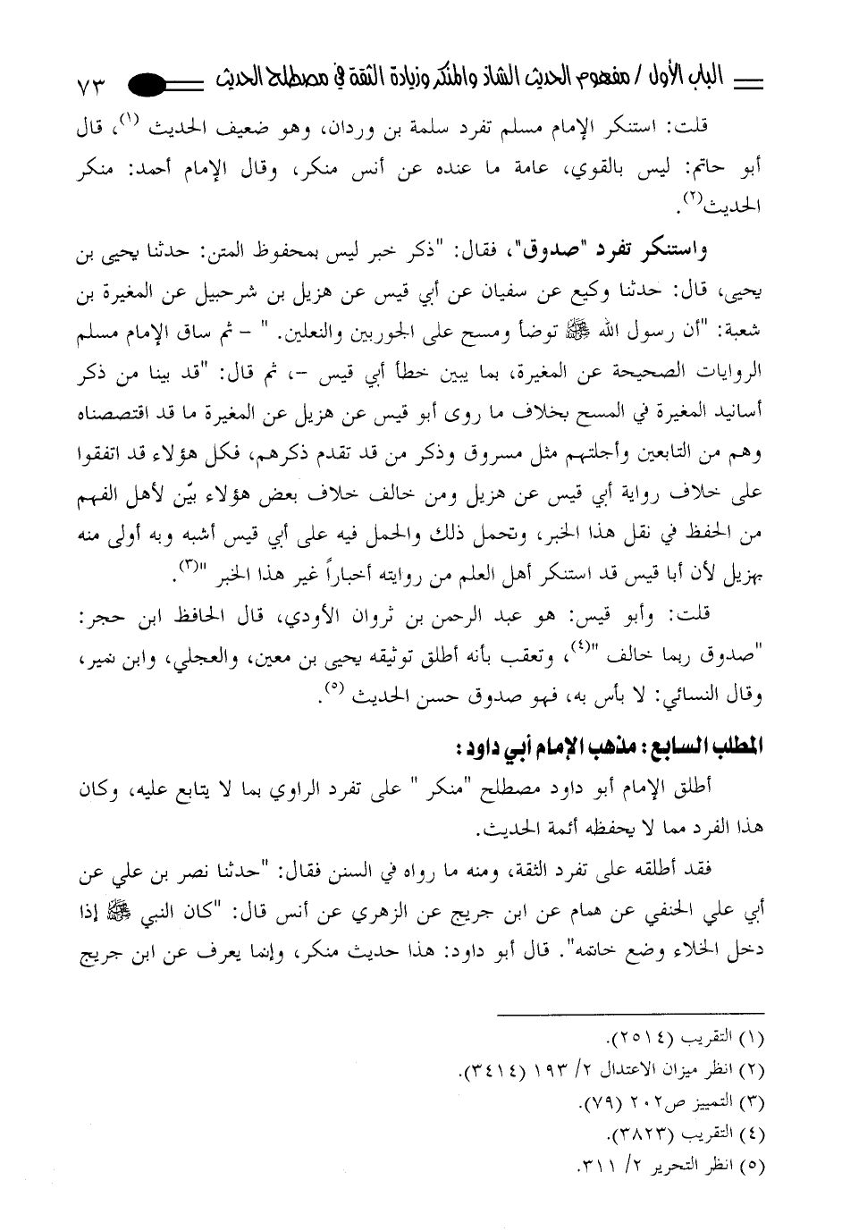 واستنكر تفرد " صدوق "، فقال: " ذكر خبر ليس بمحفوظ المتن: حدثنا يحيى بن يحيى، قال: حدثنا وكيع عن سفيان عن أبي قيس عن هزيل بن شرحبيل عن المغيرة بن شعبة: ... " أن رسول الله - صلى الله عليه وسلم - توضأ ومسح على الجوربين والنعلين. " - ثم ساق الإمام مسلم الروايات الصحيحة عن المغيرة، بما يبين خطأ أبي قيس -، ثم قال: " قد بينا من ذكر أسانيد المغيرة في المسح بخلاف ما روى أبو قيس عن هزيل عن المغيرة ما قد اقتصصناه وهم من التابعين وأجلتهم مثل مسروق وذكر من قد تقدم ذكرهم، فكل هؤلاء قد اتفقوا على خلاف رواية أبي قيس عن هزيل ومن خالف خلاف بعض هؤلاء بين لأهل الفهم من الحفظ في نقل هذا الخبر، وتحمل ذلك والحمل فيه على أبي قيس
