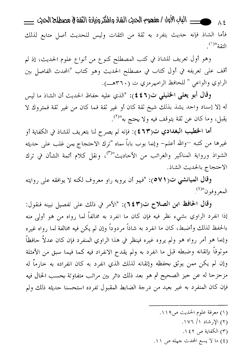 أما الخطيب البغدادي ت (463): فإنه لم يصرح لنا بتعريف للشاذ في الكفاية أو غيرها من كتبه -والله أعلم- وإنما بوب باباً سماه " ترك الاحتجاج بمن غلب على حديثه الشواذ ورواية المناكير والغرائب من الأحاديث" (¬3)،ونقل كلام أئمة الشأن في ترك الاحتجاج بالحديث الشاذ.