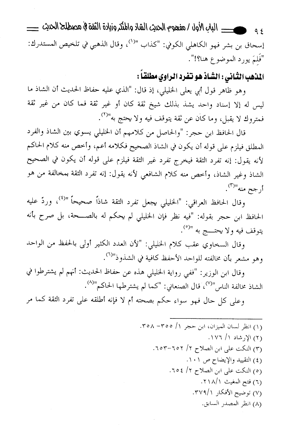 قال الحافظ ابن حجر: " والحاصل من كلامهم أن الخليلي يسوي بين الشاذ والفرد المطلق فيلزم على قوله أن يكون في الشاذ الصحيح فكلامه أعم، وأخص منه كلام الحاكم لأنه يقول: إنه تفرد الثقة فيخرج تفرد غير الثقة فيلزم على قوله أن يكون في الصحيح الشاذ وغير الشاذ، وأخص منه كلام الشافعي لأنه يقول: إنه تفرد الثقة بمخالفة من هو أرجح منه" (¬3).