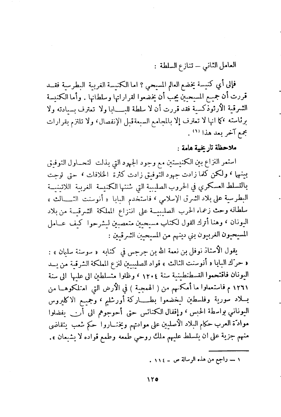 (حرك البابا (أنوسنت الثالث) قواد الصليبيين لنزع المملكة الشرقية من يد اليونان فاقتحموا القسطنطينية سنة 1204، وظلوا متسلطين عليها إلى سنة 1261 م فاستعملوا ما أمكنهم من (الهمجية) في الأرض التي امتلكوها من بلاد سورية وفلسطين ليخضعوا بطاركة أورشليم، وجميع الأكليروس اليوناني بواسطة الحبس، وإقفال الكنائس حتى أحوجوهم إلى أن يفضلوا موادة العرب حكام البلاد الأصليين على موادتهم ويختاروا حكم شعب يتقاضى منهم جزية على أن يتسلط عليهم ملك روحي طمعه وطمع قواده لا يشبعان).