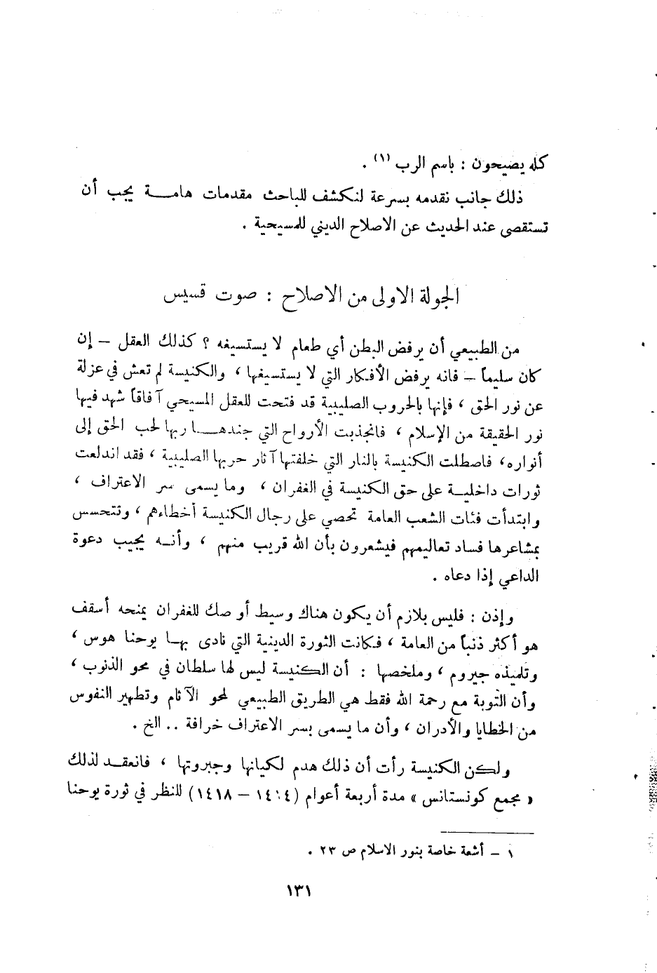 الجولة الأولى من الاصلاح: صوت قسيس من الطبيعي أن يرفض البطن أي طعام لا يستسيغه؟ كذلك العقل - إن كان سليما - فإنه يرفض الأفكار التي لا يستيغها، والكنيسة لم تعش في عزلة عن نور الحق، فإنها بالحروب الصليبية قد فتحت للعقل المسيحي آفاقا شهد فيها نور الحقيقة من الإسلام، فانجذبت الأرواح التي جندها ربها لحب الحق إلى أنواره، فاصطلت الكنيسة بالنار التي خلفتها آثار حربه الصليبية، فقد اندلعت ثورات داخلية على حق الكنيسة في الغفران، وما يسمى سر الاعتراف، وابتدأت فئات الشعب العامة تحصي على رجال الكنيسة أخطاءهم، وتتحسس بمشاعرها فساد تعاليمهم فيشعرون بأن الله قريب منهم، وأنه يجيب دعوة الداعي إذا دعاه.