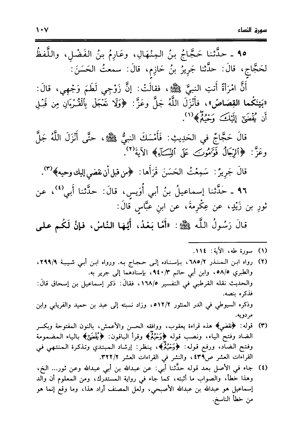 95 - حدثنا حجاج بن المنهال وعارم بن الفضل واللفظ لحجاج قال حدثنا جرير بن حازم قال سمعت الحسن