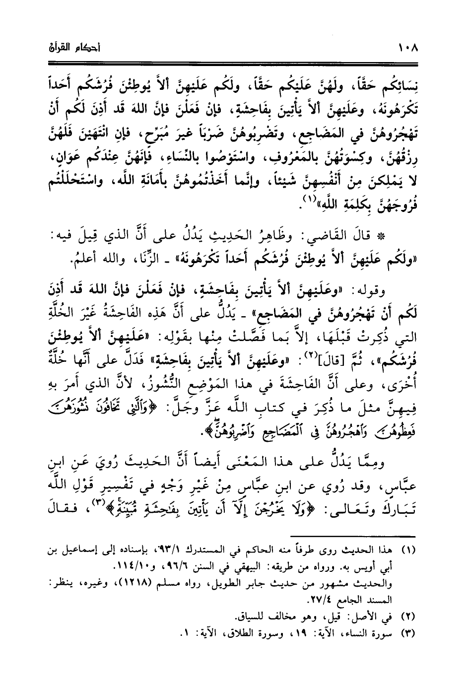 ومما يدل على هذا المعني ايضا ان الحديث روي عن ابن عباس من غير وجه في تفسير قول الله تبارك وتعالى ولا يخرجن الا ان ياتين بفاحشة مبينة فقال