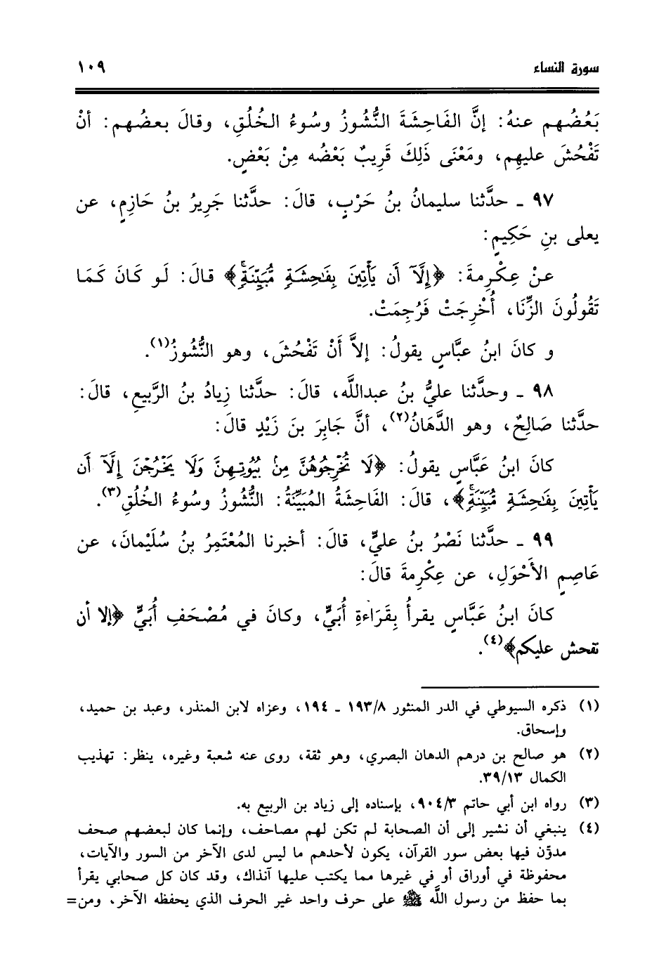 بعضهن عنه ان الفاحشة النشوز وسوء الخلق وقال بعضهم ان تفحش عليهم ومعني ذلك قريب بعضه من بعض