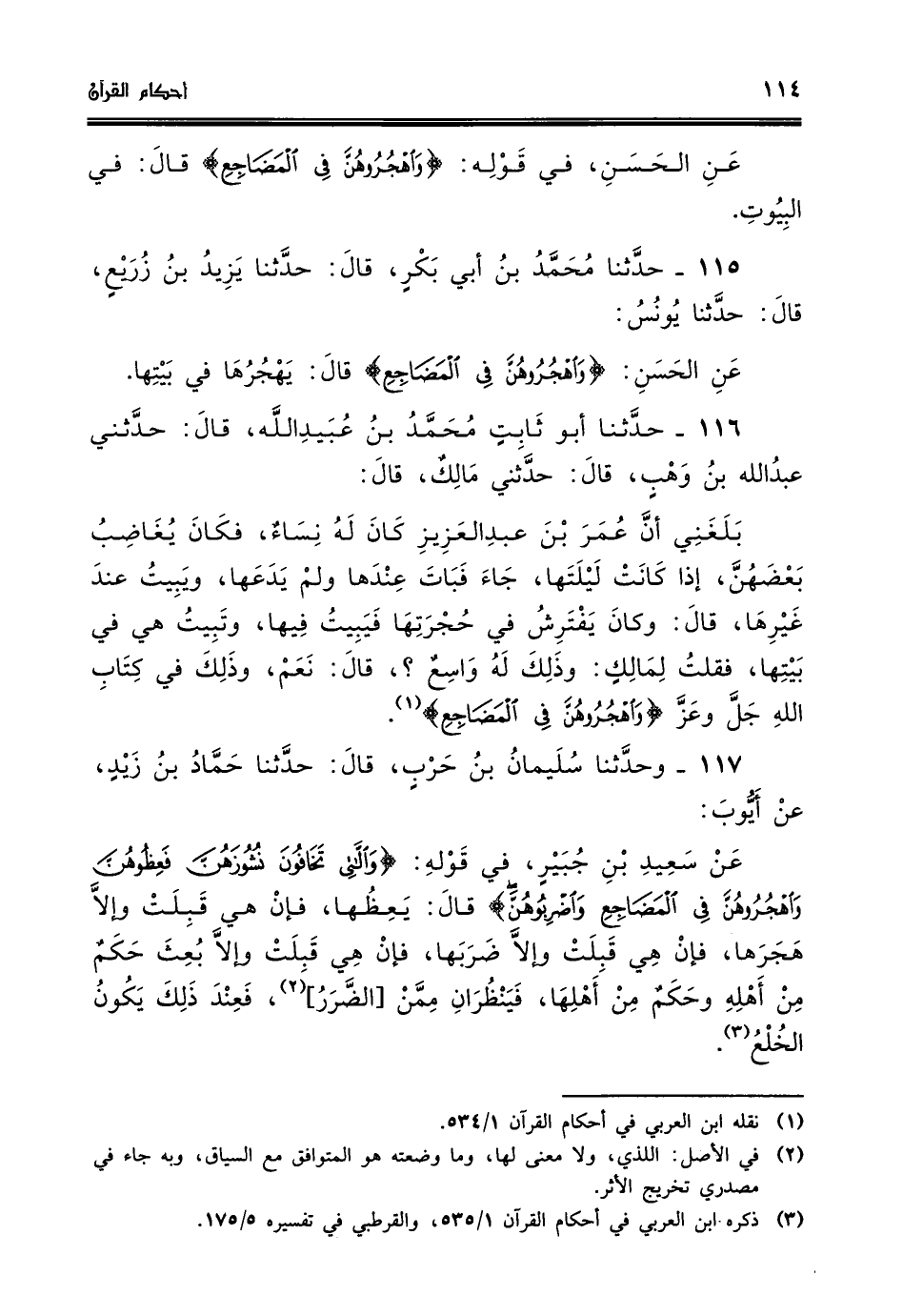 عن الحسن في قوله واهجروهن في المضاجع قال في البيوت