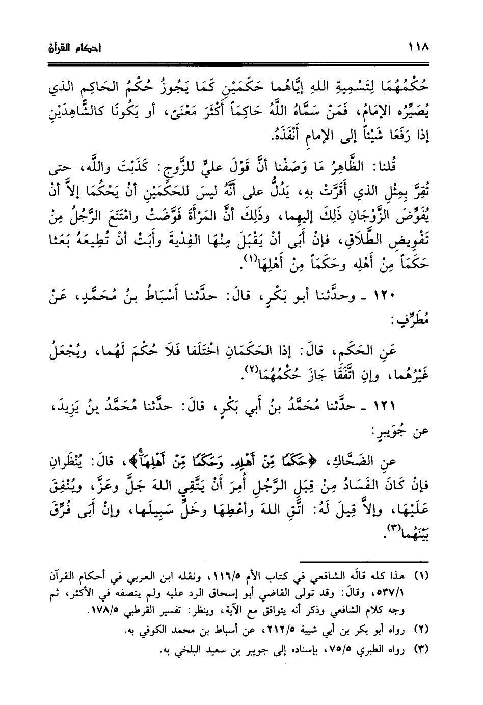 حكمهما لتسمية الله اياهما حكمين كما يجوز حكم الحاكم الذي يجوز حكم الحاكم الذي يصيره الامام فمن سماه الله حاكما اكثر معني ان يكونا كالشاهدين اذا رفعنا شيئا الى الامام انفذه