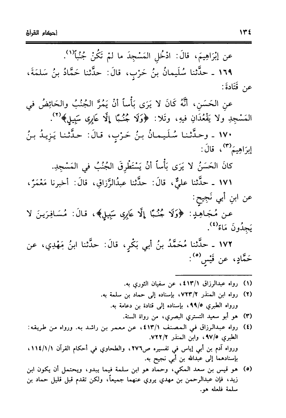 عن الحسن انه كان لا يرى باسا ان يمر الجنب والحائض في المسجد ولا يقعدان فيه وتلا ولا جنبا الا عابري سبيل