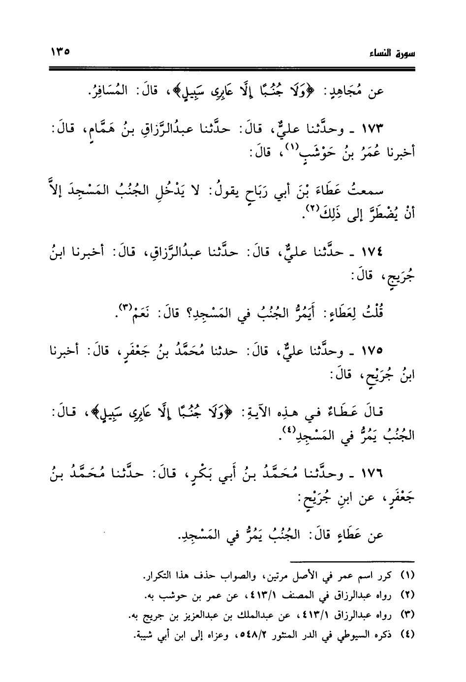 173 - وحدثنا علي قال حدثنا عبد الرزاق بن همام قال اخبرنا عمر بن حوشب قال