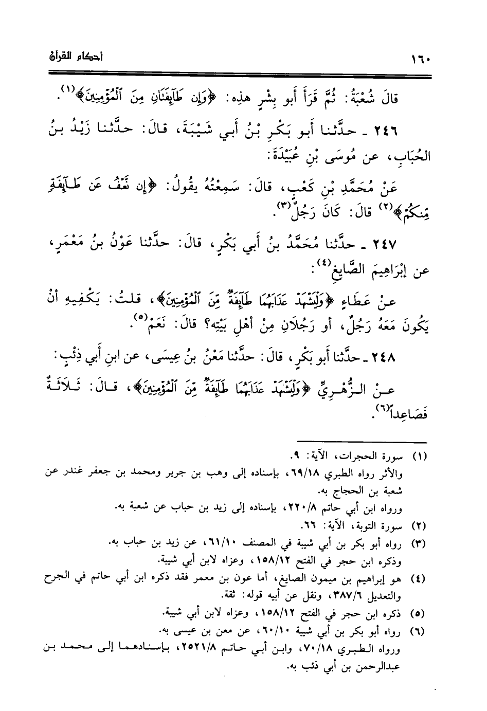 248 - حدثنا ابو بكر قال حدثنا معن بن عيسى عن ابن ابي ذئب عن الزهري وليشهد عذابهما طائفة من المؤمنين قال ثلاثة فصاعدا
