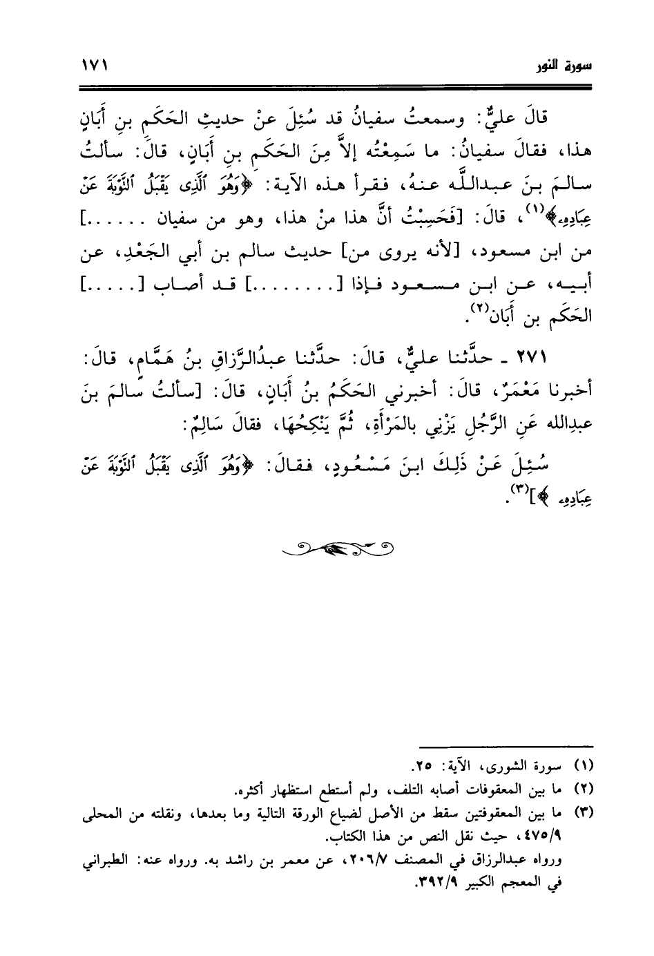 قال علي وسمعت سفيان قد سئل عن حديث الحكم بان هذا فقال سفيان ما سمعته الا من الحكم بن ابان قال سالت سالم بن عبد الله عنه فقرا هذه الاية وهو الذى يقبل التوبة عن عباده قال فحسبت ان هذا من هذا وهو من سفيان
