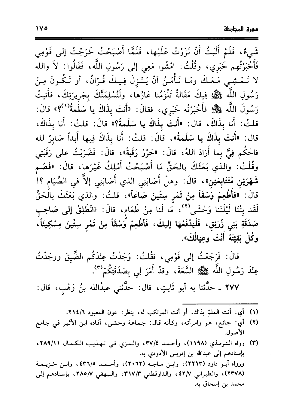 شيئ فلم البث ان نزوت عليها فلما اصبحت خرجت الى قومي فاخبرتهم خبري وقلت امشوا معي الى رسول الله لا والله لا نمشي معك وما نامن ان ينزل فيك قران او تكون من رسول الله صلي الله عليه وسلم فيك مقالة تلزمنا عارها ولنسلمنك بجريرتك فاتيت رسول الله صلي الله عليه وسلم فاخبرته خبري فقال انت بذاك ياسلمة قال قلت انا بذاك قال انت بذاك يا سلمة قال قلت انا بذاك قال انت بذاك يا سلمة قال قلت انا بذاك فيها ابدا صابر لله فاحكم في بما اراد الله قال حرر رقبة قال فضربت على رقبتي وقلت والذي بعثك بالحق ما اصبحت املك غيرها قال فصم شهرين ممتابعين قال وهل اصابني الذي اصابني الا في الصيام قال فاطعم وسقا من تمر ستين صاعا قلت والذي بعثك بالحق لقد بتنا ليلتنا وحشى ما لنا من طعام قال انطلق الى صاحب صدقة بني زريق فليدفعها اليك فاطعم وسقا من تمر ستين مسكينا وكل بقيته انت وعيالك