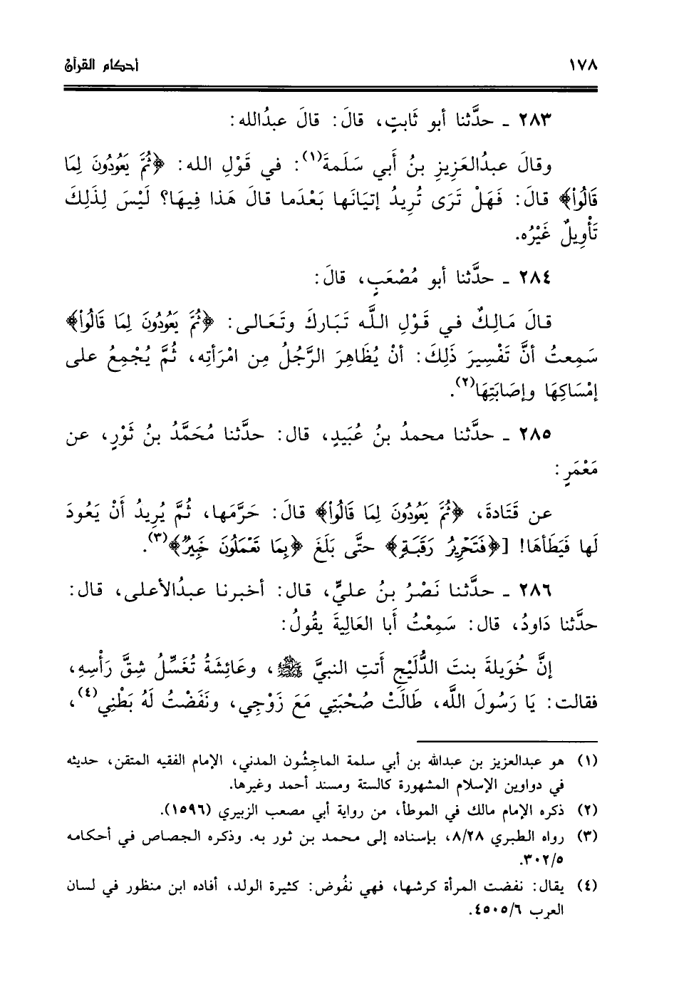 وقال عبد العزيز بن ابي سلمة في قول الله ثم يعودون لما قالوا قال فهل ترى تريد اتيانها بعدما قال هذا فيها ليس لذلك تاويل غيره