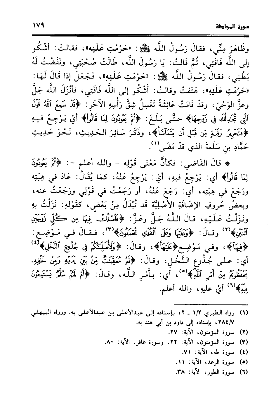 قال القاضي فكان معني قوله والله اعلم ثم يعودون لما قالوا أي يرجع فيه أي يرجع عنه كما يقال عاد في هبته ورجع في هبته أي رجع عنه او رجعت في قولي ورجعت عنه وبعض حروف الاضافة الاصلية قد تبدل من بعض كقوله نزلت به ونزلت عليه قال الله جل وعز فاسلك فيها من كل زوجين اثنين وقال وعليها وعلى الفلك تحملون فقال في موضع فيها وفي موضع عليها وقال ولاصلبنكم في جذوع النخل أي على جذوع النخل وقال له معقبات من بين يديه ومن خلفه