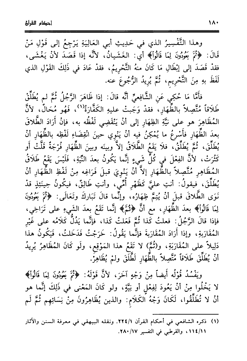 وهذا التفسير الذي في حديث ابي العالية الى قول من قال ثم يعودون لما قالوا أي الغشيان لانه اذا قصد لان يغشى فقد قصد الى ابطال ما كان منه التحريم فقد عاد في ذلك القول الذي لفظ به من التحريم ثم يريد الرجوع عنه