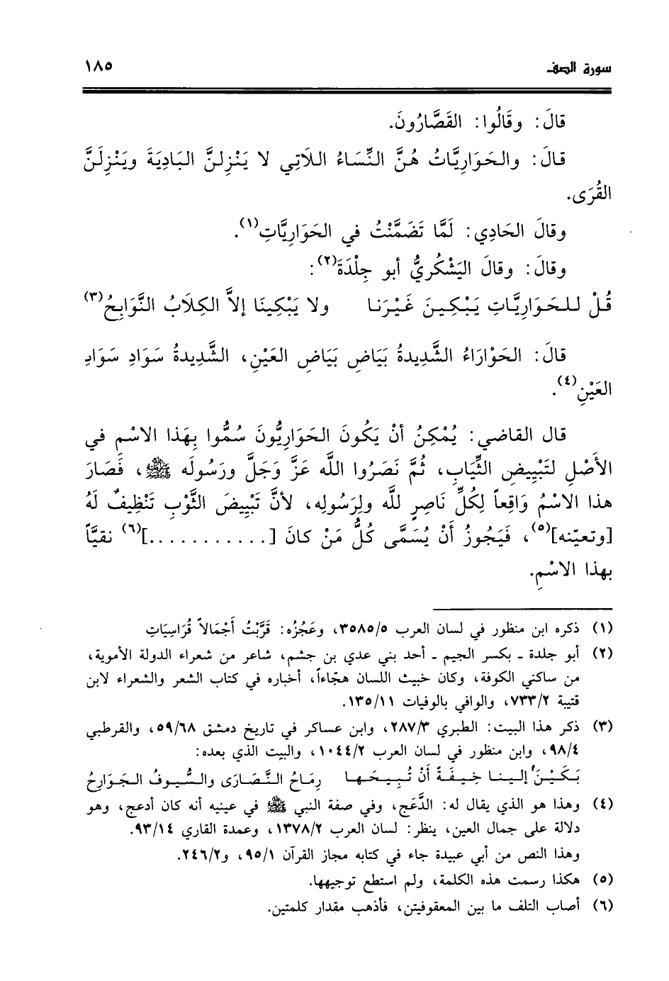 قال والحواريات هن النساء اللاتي لا ينزلن البادية وينزلن القرى